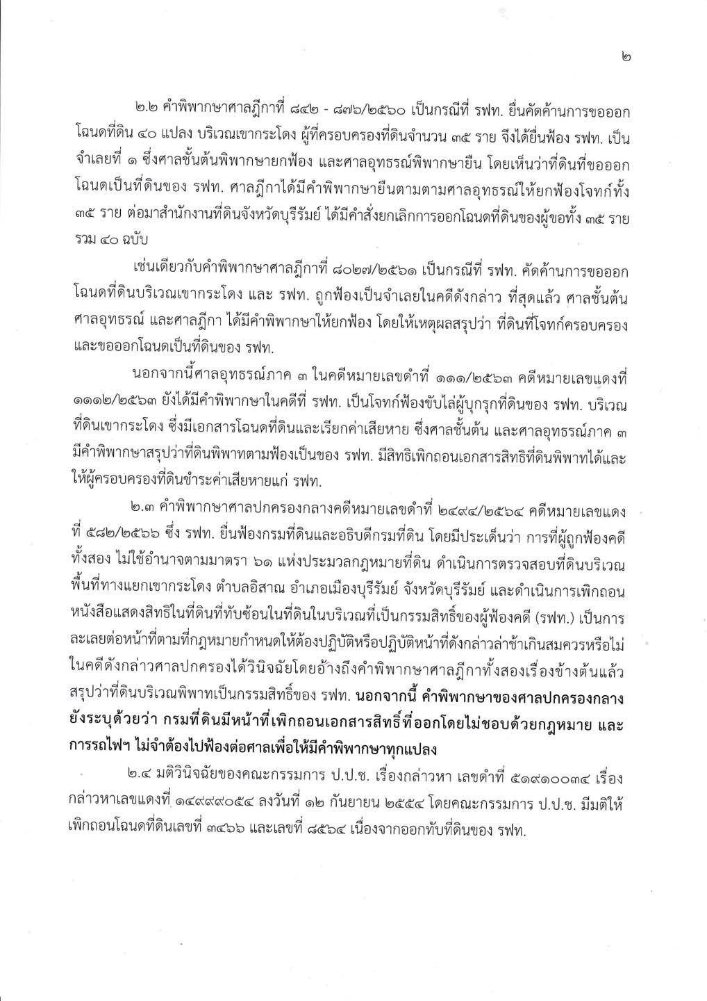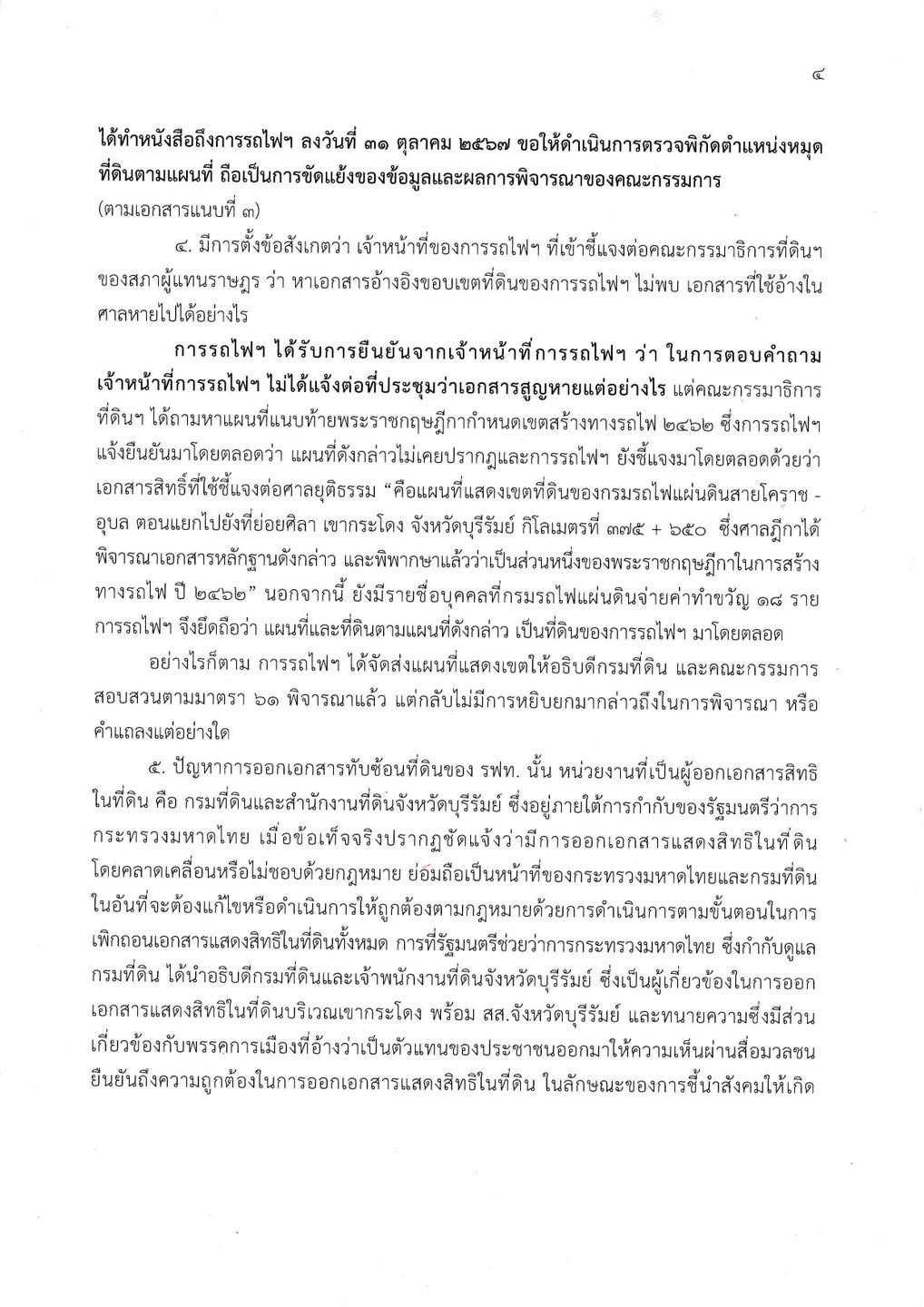 ทั้งนี้ ปัญหาการออกเอกสารทับซ้อนที่ดินของ รฟท. นั้น หน่วยงานที่เป็นผู้ออกเอกสารสิทธิในที่ดิน คือ กรมที่ดินและสำนักงานที่ดินจังหวัดบุรีรัมย์ ซึ่งอยู่ภายใต้การกำกับของรัฐมนตรีว่าการกระทรวงมหาดไทย เมื่อข้อเท็จจริงปรากฏว่า มีการออกเอกสารแสดงสิทธิในที่ดินโดยคลาดเคลื่อนหรือไม่ชอบด้วยกฎหมาย จึงถือเป็นหน้าที่ของกระทรวงมหาดไทยและกรมที่ดินที่จะต้องแก้ไขหรือดำเนินการให้ถูกต้องตามกฎหมายด้วยการดำเนินการตามขั้นตอนในการเพิกถอนเอกสารแสดงสิทธิในที่ดินทั้งหมด
