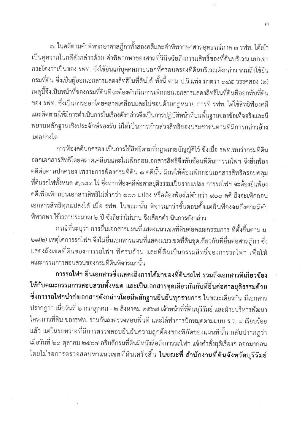 ดังนั้น จึงเป็นหน้าที่ของกรมที่ดินที่จะต้องดำเนินการเพิกถอนเอกสารแสดงสิทธิในที่ดินที่ออกทับที่ดินของ รฟท. ซึ่งเป็นการออกโดยคลาดเคลื่อนและไม่ชอบด้วยกฎหมาย อีกทั้ง ไม่ได้เป็นการก้าวล่วงสิทธิของประชาชนตามที่มีการกล่าวอ้างแต่อย่างใด ส่วนกรณีที่มีคำถามว่า เหตุใด รฟท. จึงไม่ยื่นเอกสารแผนที่แสดงแนวเขตที่ดินชุดเดียวกับที่ยื่นต่อศาลฎีกา ซึ่งแสดงถึงเขตที่ดินของการรถไฟฯ ที่ครบถ้วน และที่ดินเป็นกรรมสิทธิ์ของการรถไฟฯ เพื่อให้คณะกรรมการสอบสวนของกรมที่ดินพิจารณานั้น ขอชี้แจงว่า รฟท. ยื่นเอกสารซึ่งแสดงถึงการได้มาของที่ดินรถไฟ รวมถึงเอกสารที่เกี่ยวข้อง ให้กับคณะกรรมการสอบสวนทั้งหมด และเป็นเอกสารชุดเดียวกันกับที่ยื่นต่อศาลยุติธรรมด้วย