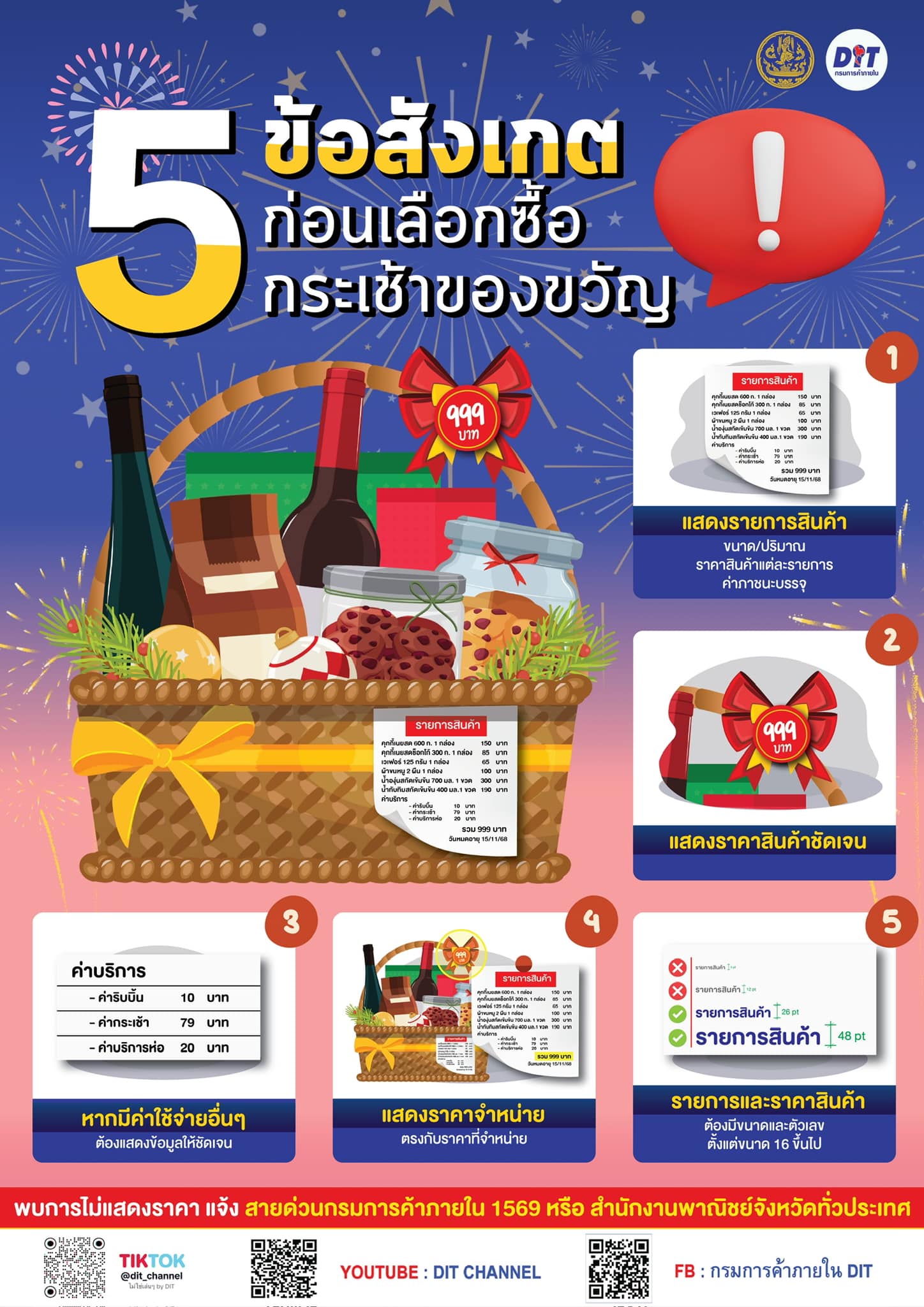 หากพบกระเช้าไม่แสดงราคา แจ้งได้ที่ สายด่วน 1569 หรือ สำนักงานพาณิชย์จังหวัดทั่วประเทศ กรมการค้าภายใน พร้อมดูแลให้ทุกคนมั่นใจในการซื้อกระเช้าของขวัญ