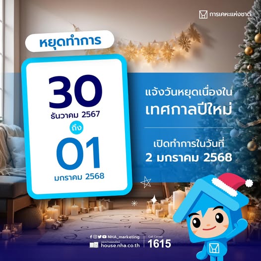 การเคหะแห่งชาติ แจ้งหยุดทำการ วันที่ 30 ธันวาคม 2567 – 1 มกราคม 2568 เนื่องในเทศกาลปีใหม่ และเปิดทำการในวันที่ 2 มกราคม 2568