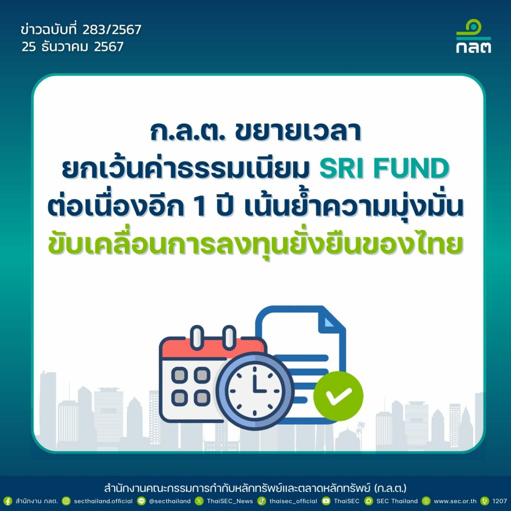 สำนักงานคณะกรรมการกำกับหลักทรัพย์และตลาดหลักทรัพย์ (ก.ล.ต.) ออกประกาศขยายเวลาการยกเว้นค่าธรรมเนียมการจัดตั้งและแก้ไขโครงการจัดการกองทุนรวมเพื่อเป็น “กองทุนรวมเพื่อความยั่งยืน”(Sustainable and Responsible Investing Fund: SRI Fund) รวมถึง “กองทุนรวมไทยเพื่อความยั่งยืน” (Thai ESG) ออกไปอีก 1 ปี จากเดิมที่จะสิ้นสุดในเดือนธันวาคม 2567 เพื่อเร่งเครื่องสนับสนุนการลงทุนในหุ้นกลุ่ม value up และผลักดันการลงทุนที่ยั่งยืนในประเทศไทย