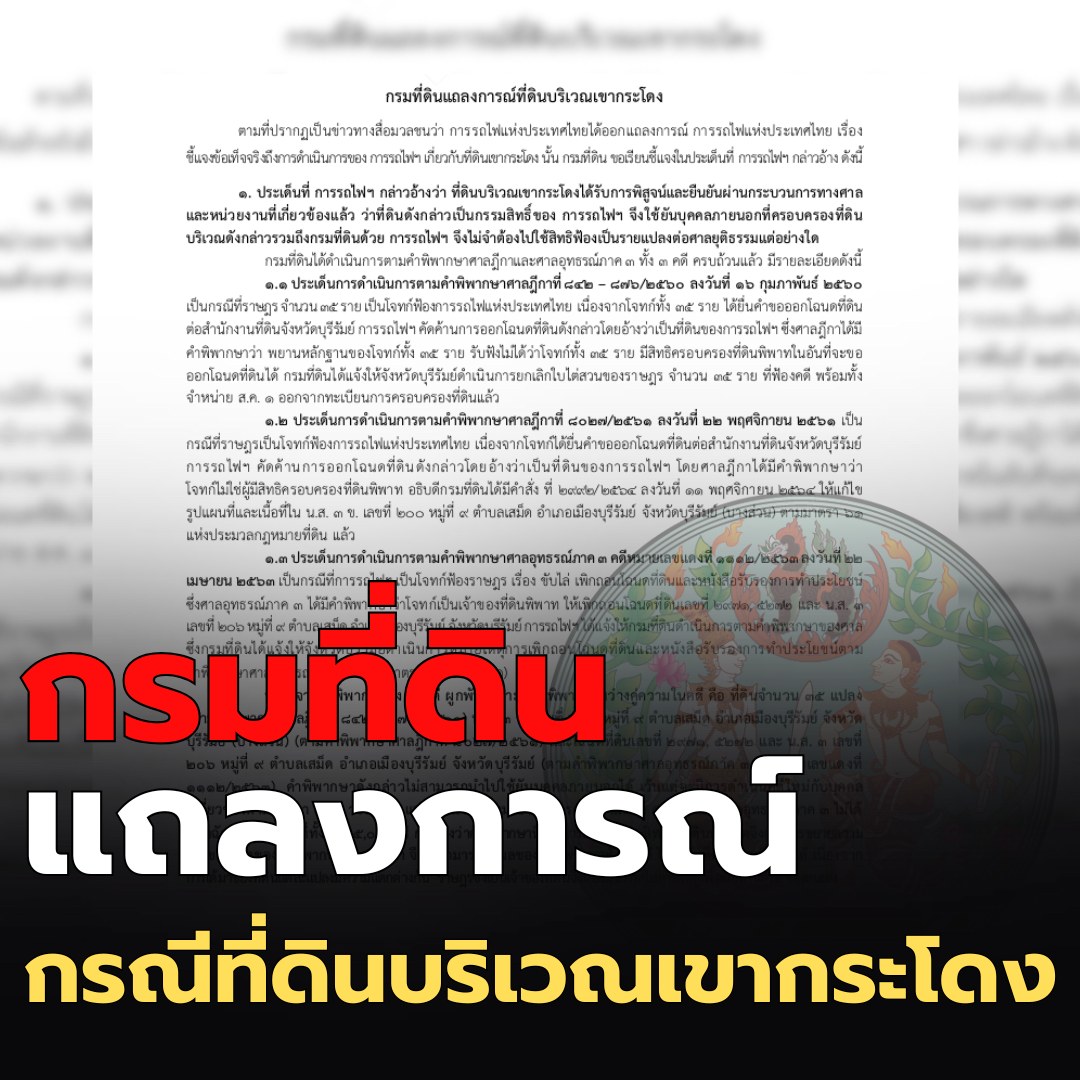 กรมที่ดิน แถลงการณ์ที่ดินบริเวณเขากระโดง ตามที่ปรากฏเป็นข่าวทางสื่อมวลชนว่า การรถไฟแห่งประเทศไทยได้ออกแถลงการณ์ การรถไฟแห่งประเทศไทย เรื่อง ชี้แจงข้อเท็จจริงถึงการดำเนินการของ การรถไฟฯ เกี่ยวกับที่ดินเขากระโดง นั้น กรมที่ดิน ขอเรียนชี้แจงในประเด็นที่ การรถไฟฯ กล่าวอ้าง ดังนี้ https://shorturl.asia/gUbCz