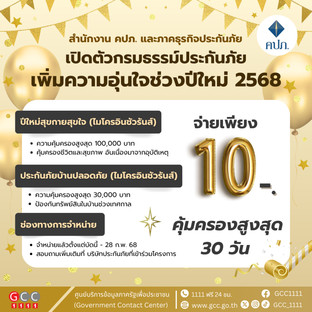คปภ. เปิดตัวประกันภัย เบี้ยประกันภัยเพียง 10 บาท คุ้มครองสูงสุด 100,000 บาท เพิ่มความอุ่นใจช่วงปีใหม่ 68