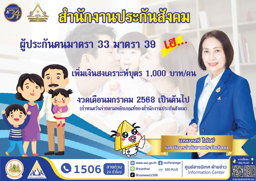 สปส. เพิ่มสิทธิประโยชน์กรณีสงเคราะห์บุตรเป็น 1,000 บาท/เดือน ต่อบุตร 1 คน มีผลบังคับใช้มกราคม 2568