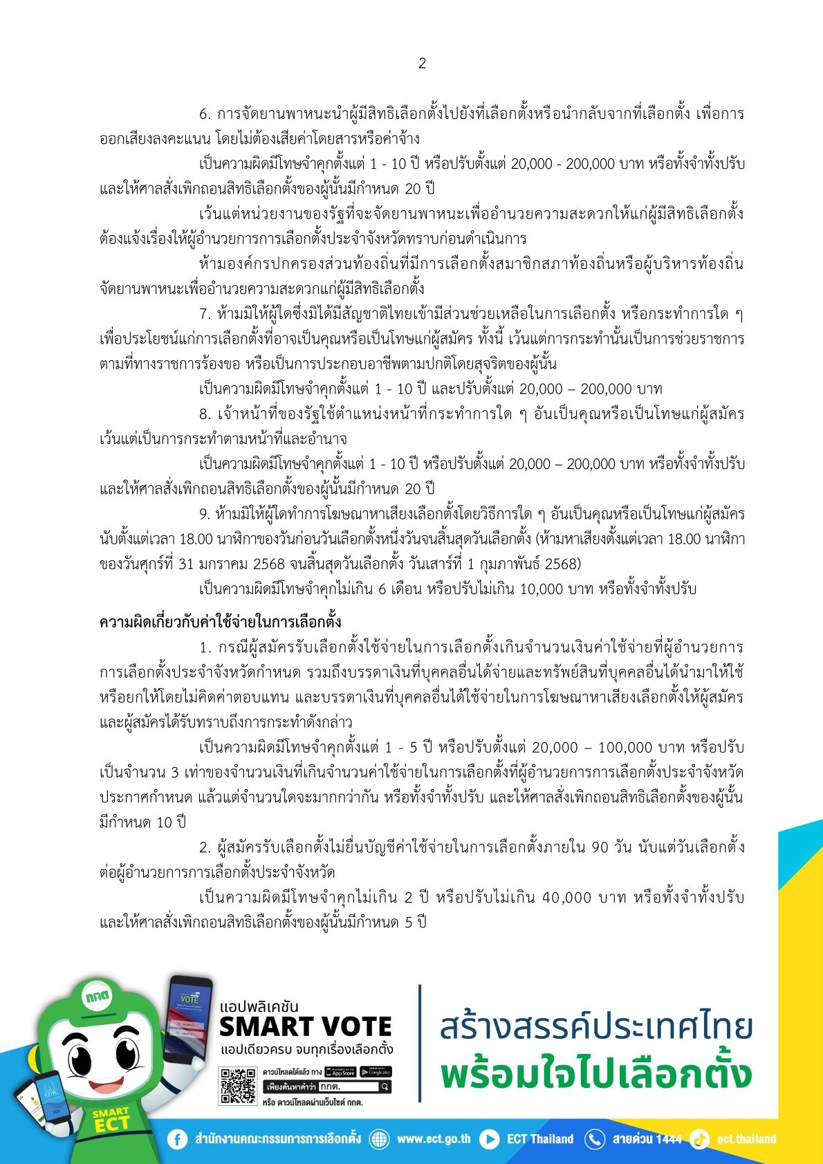 - ห้ามมิให้ผู้ใดทําการโฆษณาหาเสียงเลือกตั้งโดยวิธีการใด ๆ อันเป็นคุณหรือเป็นโทษแก่ผู้สมัคร นับตั้งแต่เวลา 18.00 นาฬิกาของวันก่อนวันเลือกตั้งหนึ่งวันจนสิ้นสุดวันเลือกตั้ง (ห้ามหาเสียงตั้งแต่เวลา 18.00 นาฬิกา ของวันศุกร์ที่ 31 มกราคม 2568 จนสิ้นสุดวันเลือกตั้ง วันเสาร์ที่ 1 กุมภาพันธ์ 2568) เป็นความผิดมีโทษจําคุกไม่เกิน 6 เดือน หรือปรับไม่เกิน 10,000 บาท หรือทั้งจําทั้งปรับ