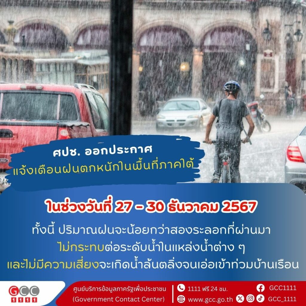 ศปช. ออกประกาศแจ้งเตือนฝนตกหนักในพื้นที่ภาคใต้ช่วงวันที่ 27 – 30 ธ.ค. 67
