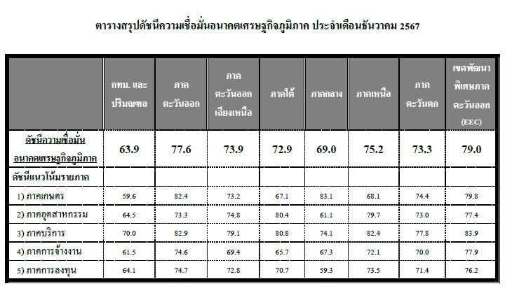 สำนักงานเศรษฐกิจการคลัง รายงานดัชนีความเชื่อมั่นอนาคตเศรษฐกิจภูมิภาค ประจำเดือนธันวาคม 2567