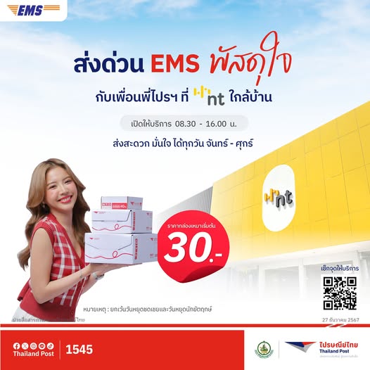 ไปรษณีย์ไทย ส่งด่วน EMS กับเพื่อนพี่ไปรฯ ราคากล่องเหมาเริ่มต้น 30 บาท ที่ศูนย์บริการ NT ทั่วประเทศ ข่าวสารกิจกรรม ไปรษณีย์ไทย ส่งด่วน EMS กับเพื่อนพี่ไปรฯ ราคากล่องเหมาเริ่มต้น 30 บาท ที่ศูนย์บริการ NT ทั่วประเทศ บริษัท ไปรษณีย์ไทย จำกัด ส่งด่วน EMS กับเพื่อนพี่ไปรฯ ราคากล่องเหมาเริ่มต้น 30 บาท ที่ศูนย์บริการ NT ทั่วประเทศ เปิดให้บริการเวลา 08.30 – 16.00 น. ทุกวันจันทร์ – วันศุกร์ จัดส่งถึงภายใน 1 – 2 วัน ตรวจสอบสถานะได้ 24 ชั่วโมง เช็กจุดให้บริการส่งด่วน EMS เพื่อนพี่ไปรฯ ที่ https://shorturl.asia/nw97x ที่มา : https://citly.me/7pBZu Post Views: 7 FacebookFacebookXTwitterLINELine