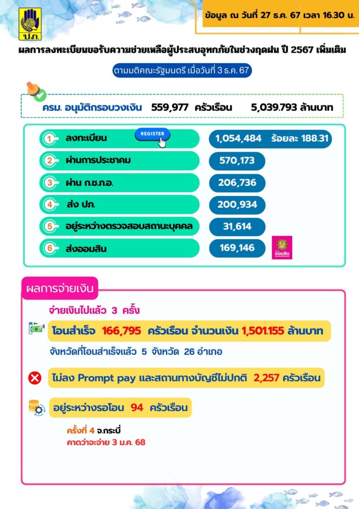 ปภ. เปิดเผยโอนเงินช่วยเหลือผู้ประสบอุทกภัย ตาม มติ ครม. 3 ธ.ค. 67 รอบที่ 3 รวม 166,795 ครัวเรือน