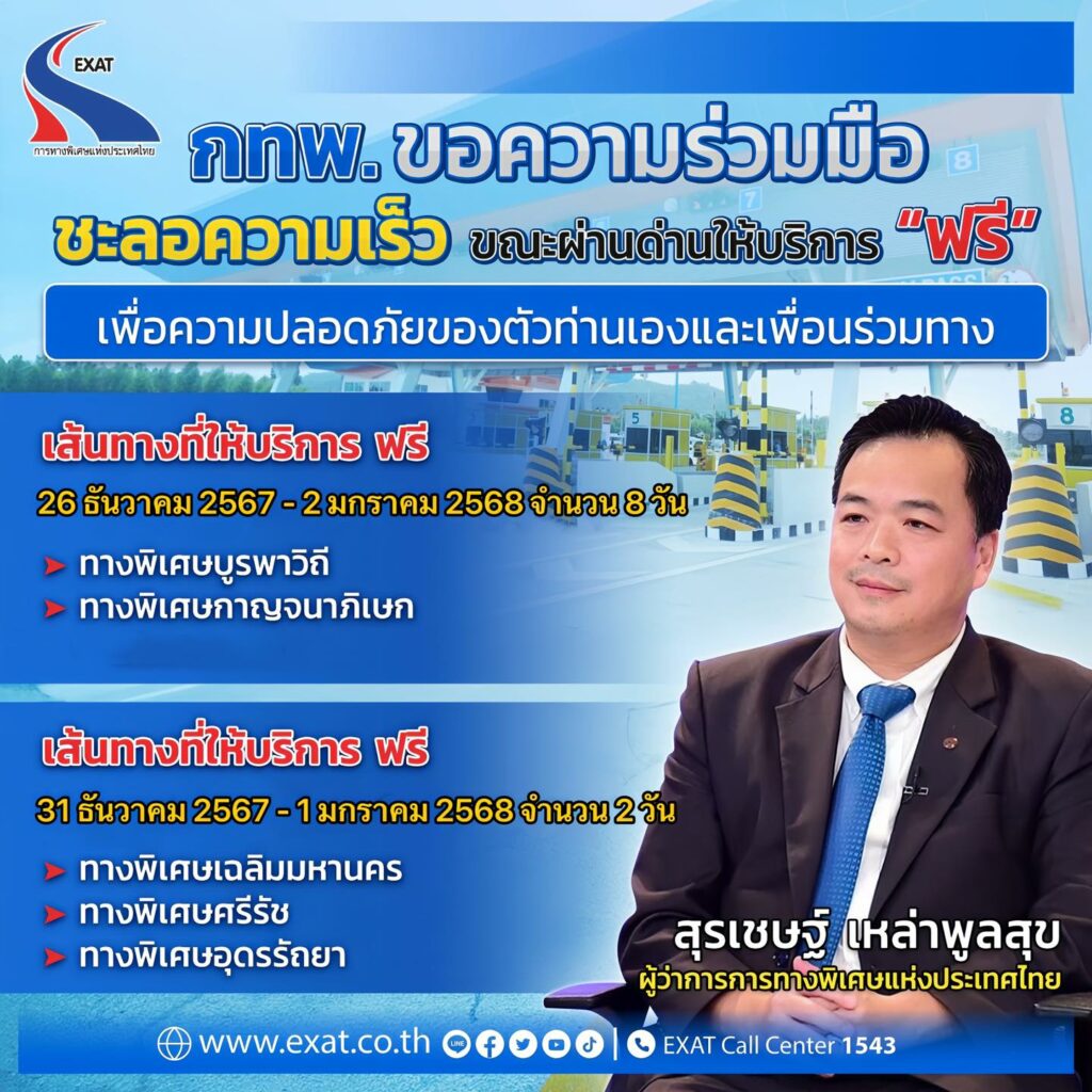การทางพิเศษแห่งประเทศไทย ขอความร่วมมือผู้ใช้บริการชะลอความเร็วรถขณะผ่านด่านให้บริการ “ฟรี” เพื่อความปลอดภัยของตัวท่านเองและเพื่อนร่วมทาง