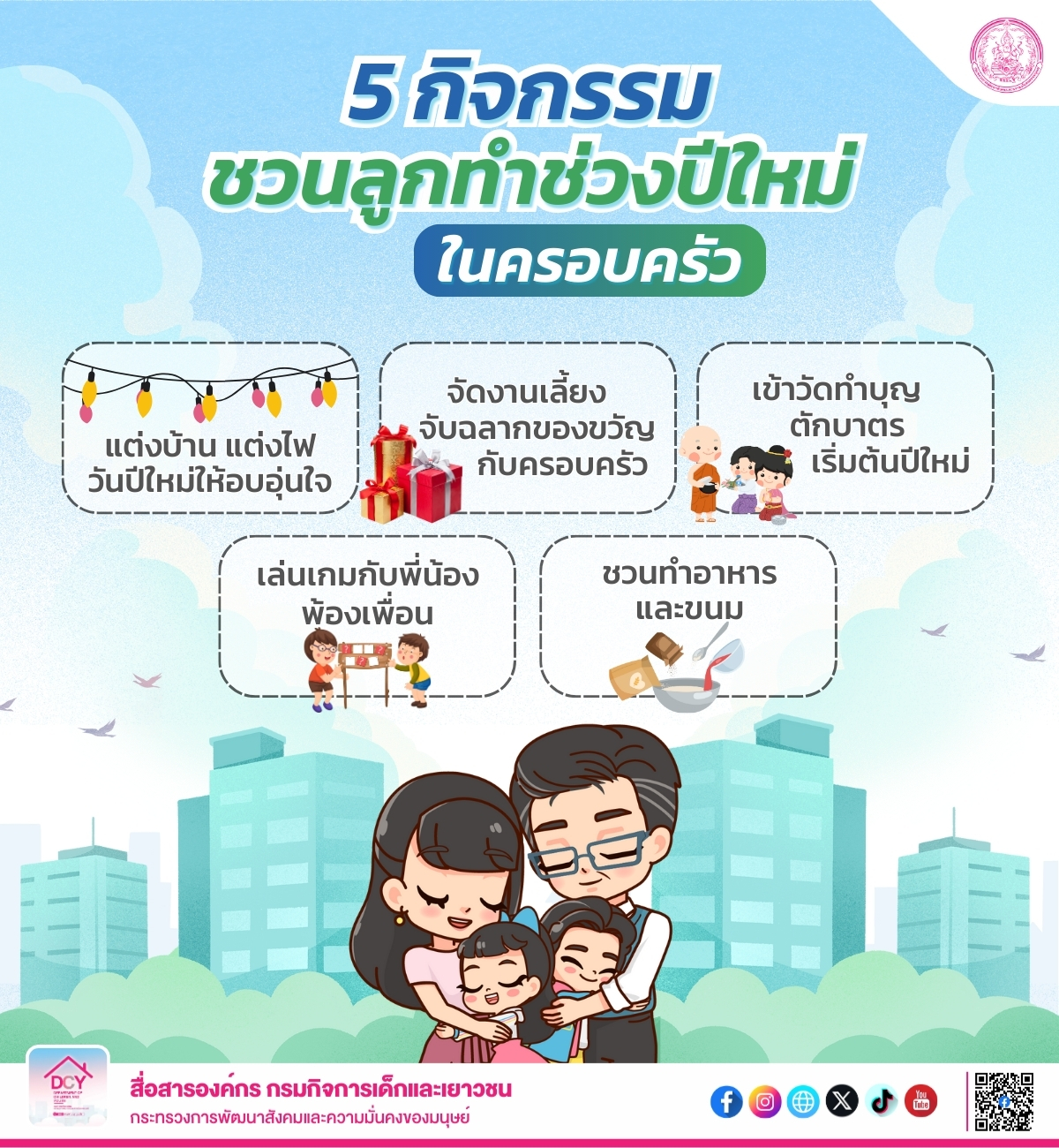 กรมกิจการเด็กและเยาวชน แนะนำ 5 กิจกรรม ชวนลูกทำช่วงปีใหม่ ในครอบครัว ข่าวสารกิจกรรม กรมกิจการเด็กและเยาวชน แนะนำ 5 กิจกรรกรมกิจการเด็กและเยาวชน ม ชวนลูกทำช่วงปีใหม่ ในครอบครัว กรมกิจการเด็กและเยาวชน แนะนำ 5 กิจกรรม ชวนลูกทำช่วงปีใหม่ ในครอบครัว มีดังนี้ แต่งบ้าน แต่งไฟวันปีใหม่ให้อบอุ่นใจ ,จัดงานเลี้ยง จับฉลากของขวัญกับครอบครัว ,เข้าวัดทำบุญตักบาตร เริ่มต้นปีใหม่ ,เล่นเกมกับพี่น้องพ้องเพื่อน ,ชวนทำอาหารและขนม ที่มา : https://shorturl.asia/dTNi5 Post Views: 37 FacebookFacebookXTwitterLINELine