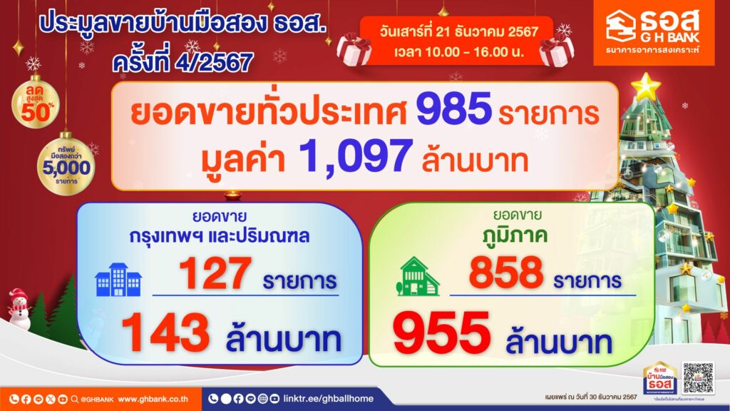 มีเฮส่งท้ายปี! คนไทยประมูลขายบ้านมือสอง ธอส. ประจำปี ครั้งที่ 4/2567 ทั่วประเทศกว่า 985 รายการ มูลค่ารวมมากกว่า 1,000 ล้านบาท