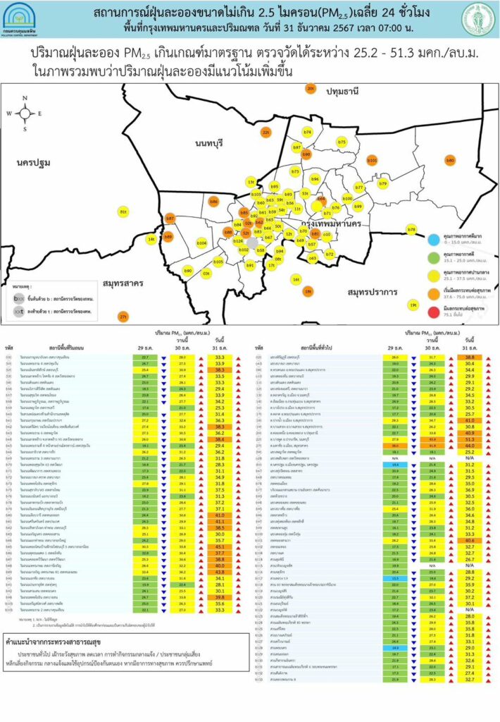- กรุงเทพมหานครและปริมณฑล เกินค่ามาตรฐาน 18 พื้นที่ ตรวจวัดได้ 22.5 – 51.3 ไมโครกรัมต่อลูกบาศก์เมตร