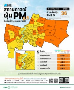 กรุงเทพมหานคร รายงานสถานการณ์ฝุ่นละอองขนาดไม่เกิน 2.5 ไมครอน (PM 2.5) ประจำวันที่ 1 มกราคม 2568 เวลา 07.00 น. ตรวจวัดค่าได้ 27-50.8 ไมโครกรัมต่อลูกบาศก์เมตร (มาตรฐานไม่เกิน 37.5 ไมโครกรัมต่อลูกบาศก์เมตร)