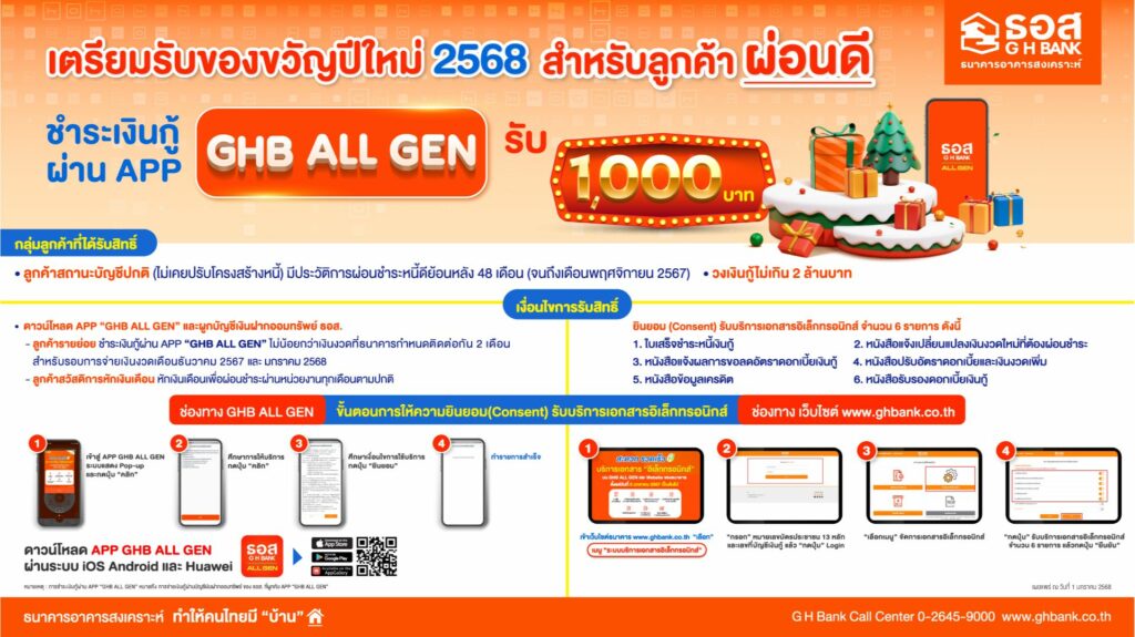 ธนาคารอาคารสงเคราะห์ (ธอส.) พร้อมมอบของขวัญปีใหม่ 2568 ตอบแทนลูกค้าให้ได้รับเงิน 1,000 บาท สำหรับลูกค้าที่มีสถานะบัญชีปกติ วงเงินกู้ไม่เกิน 2 ล้านบาท มีประวัติการผ่อนชำระเงินงวดสินเชื่อบ้านย้อนหลังรวม 48 เดือนอย่างสม่ำเสมอ นับถึงงวดเดือนพฤศจิกายน 2567 และชำระเงินงวดผ่าน Application : GHB ALL GEN ติดต่อกัน 2 เดือน (ในงวดเดือนธันวาคม 2567 และเดือนมกราคม 2568) เตรียมโอนเงินให้ลูกค้ารอบแรกเดือนมกราคม 2568