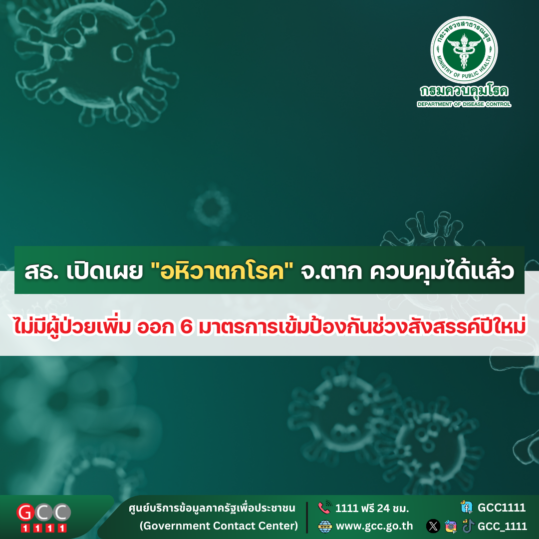 สธ. เปิดเผย “อหิวาตกโรค” จ.ตาก ควบคุมได้แล้ว ไม่มีผู้ป่วยเพิ่ม ออก 6 มาตรการเข้มป้องกันช่วงสังสรรค์ปีใหม่