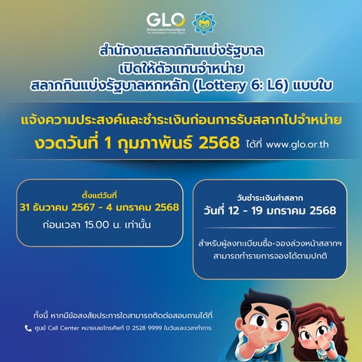 - สำนักงานสลากกินแบ่งรัฐบาล เปิดให้ตัวแทนจำหน่ายสลากกินแบ่งรัฐบาลหกหลัก (Lottery 6 : L6) แบบใบ