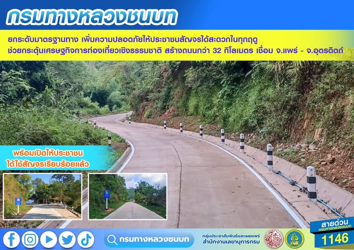 กรมทางหลวงชนบท สร้างถนนกว่า 32 กิโลเมตร เชื่อม จ.แพร่ – จ.อุตรดิตถ์ แล้วเสร็จพร้อมเปิดใช้งานแล้ว