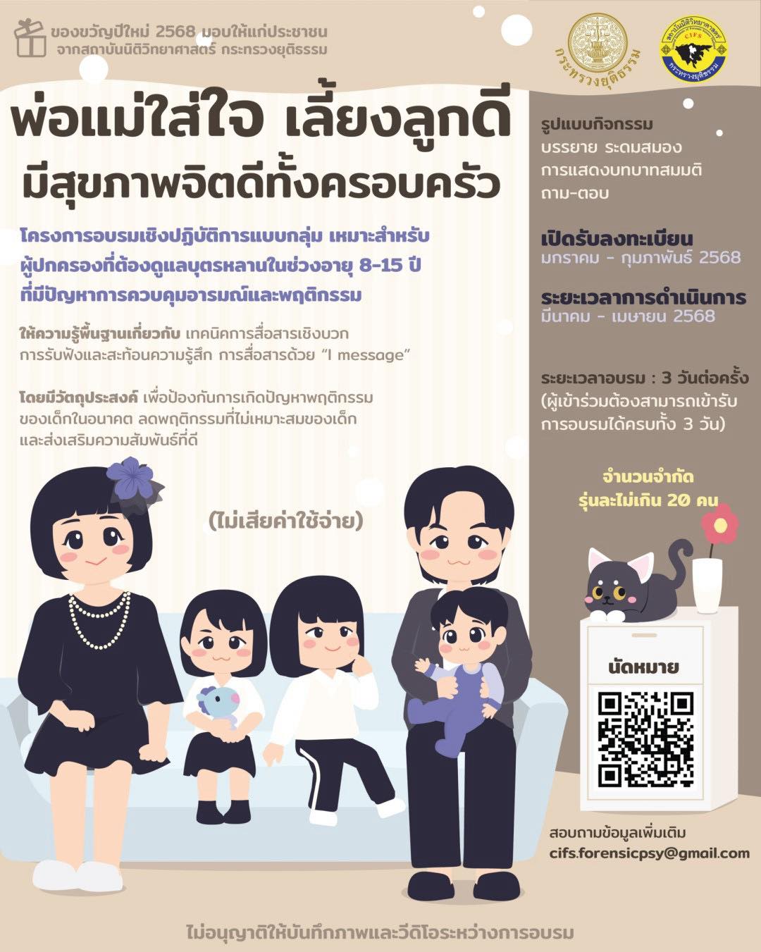 สถาบันนิติวิทยาศาสตร์ มอบของขวัญปีใหม่ 2568 พ่อแม่ใส่ใจ เลี้ยงลูกดี มีสุขภาพจิตดีทั้งครอบครัว โครงการอบรมเชิงปฏิบัติการแบบกลุ่ม เหมาะสำหรับผู้ปกครองที่ต้องดูแลบุตรหลานในช่วงอายุ 8-15 ปี ที่มีปัญหาการควบคุมอารมณ์และพฤติกรรม