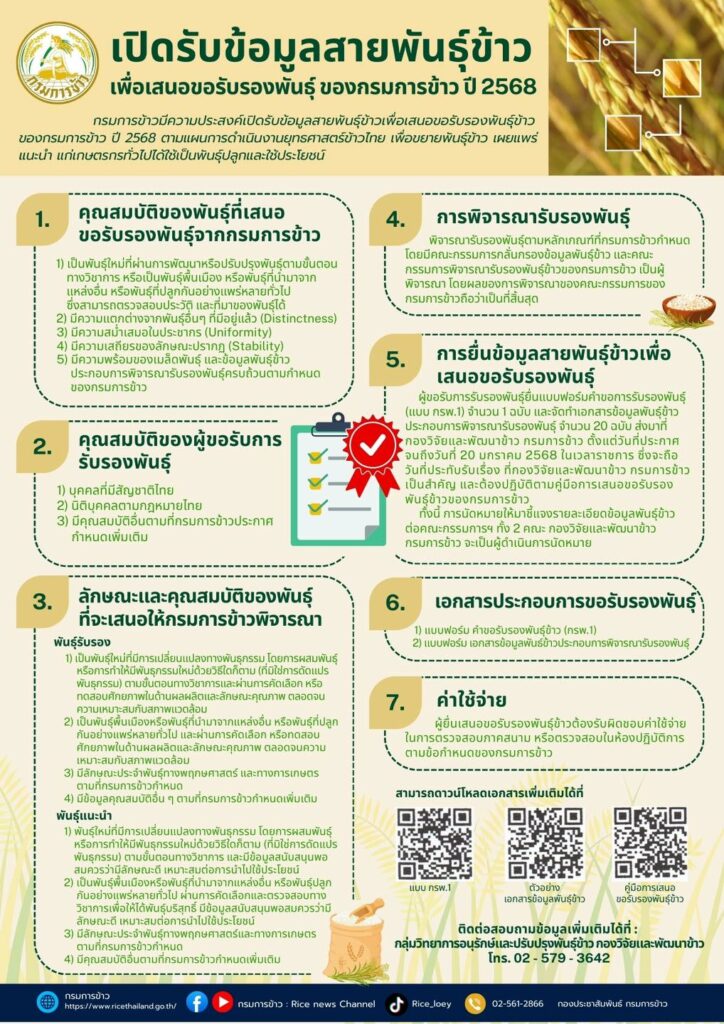 กรมการข้าว เปิดรับข้อมูลสายพันธุ์ข้าว เพื่อเสนอขอรับรองพันธุ์ของกรมการข้าว ปี 2568 บัดนี้ – 20 ม.ค. 68