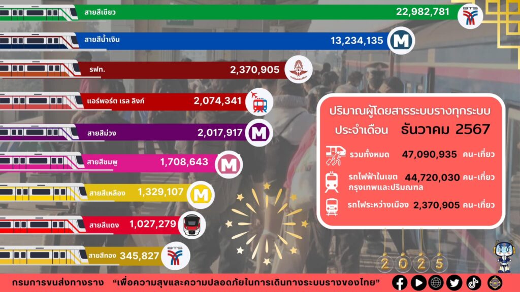 กรมการขนส่งทางราง เปิดเผยปริมาณผู้โดยสารระบบขนส่งทางราง ประจำเดือนธันวาคม 2567 ข่าวสารกิจกรรม กรมการขนส่งทางราง เปิดเผยปริมาณผู้โดยสารระบบขนส่งทางราง ประจำเดือนธันวาคม 2567 กรมการขนส่งทางราง เปิดเผยปริมาณผู้โดยสารระบบขนส่งทางราง ประจำเดือนธันวาคม 2567 มีผู้ใช้บริการทั้งหมด 47,090,935 คน-เที่ยว ประกอบด้วยรถไฟฟ้าในเขตกรุงเทพและปริมณฑล 44,720,030 คน-เที่ยวรถไฟระหว่างเมือง 2,370,905 คน-เที่ยวหมายเหตุ : คน-เที่ยว หมายถึง หน่วยการนับจำนวนผู้โดยสารที่มาใช้บริการ คือ ผู้โดยสารแตะเข้าสู่ระบบจนออกจากระบบ นับเป็น 1 คน-เที่ยว ที่มา : https://citly.me/lLixJ Post Views: 24 FacebookFacebookXTwitterLINELine