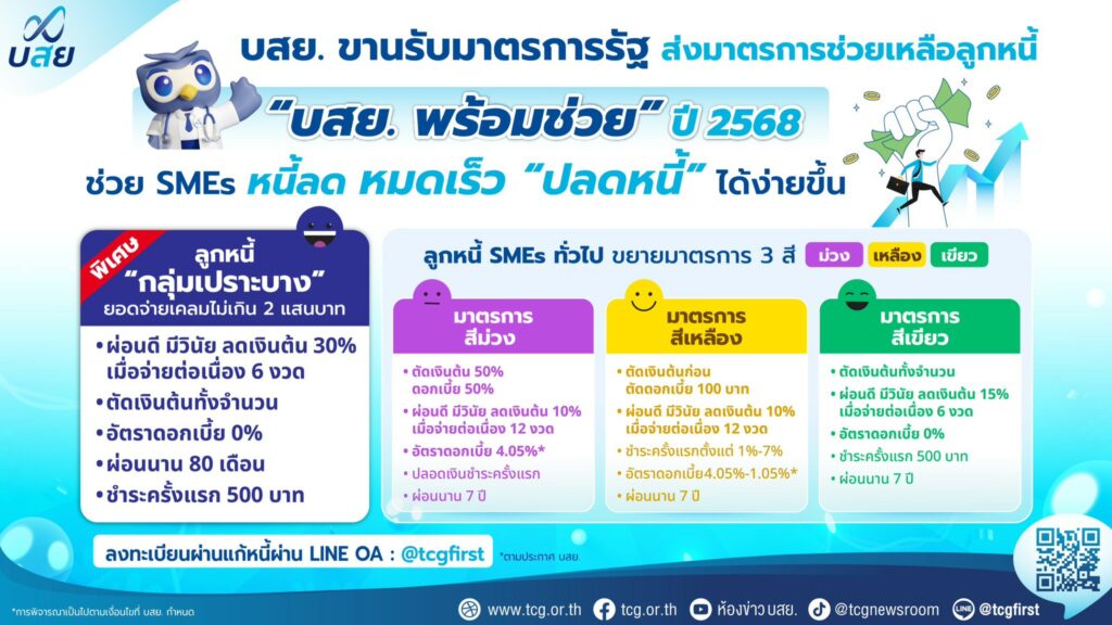 นายสิทธิกร ดิเรกสุนทร กรรมการและผู้จัดการทั่วไป บรรษัทประกันสินเชื่ออุตสาหกรรมขนาดย่อม (บสย.) เปิดเผยว่า บสย. พร้อมขานรับนโยบายภาครัฐ ในการแก้หนี้ ลดภาระทางการเงินให้กับผู้ประกอบการ SMEs เปิดตัวมาตรการแก้หนี้ ปี 2568 “บสย. พร้อมช่วย” หรือ มาตรการ 3 สี ม่วง เหลือง เขียว ปรับเงื่อนไขให้ยืดหยุ่นผ่อนปรนมากยิ่งขึ้น เพื่อช่วยเหลือผู้ประกอบการ SMEs ที่ บสย. ได้จ่ายค่าประกันชดเชย หรือ ลูกหนี้ บสย. ลดภาระ-ปลดหนี้ แก้หนี้ยั่งยืน โดยคาดว่าจะสามารถปรับโครงสร้างหนี้ผ่านมาตรการ “บสย. พร้อมช่วย” ตลอดปี 2568 ได้มากกว่า 5,000 ราย คิดเป็นมูลหนี้ไม่ต่ำกว่า 5,000 ล้านบาท