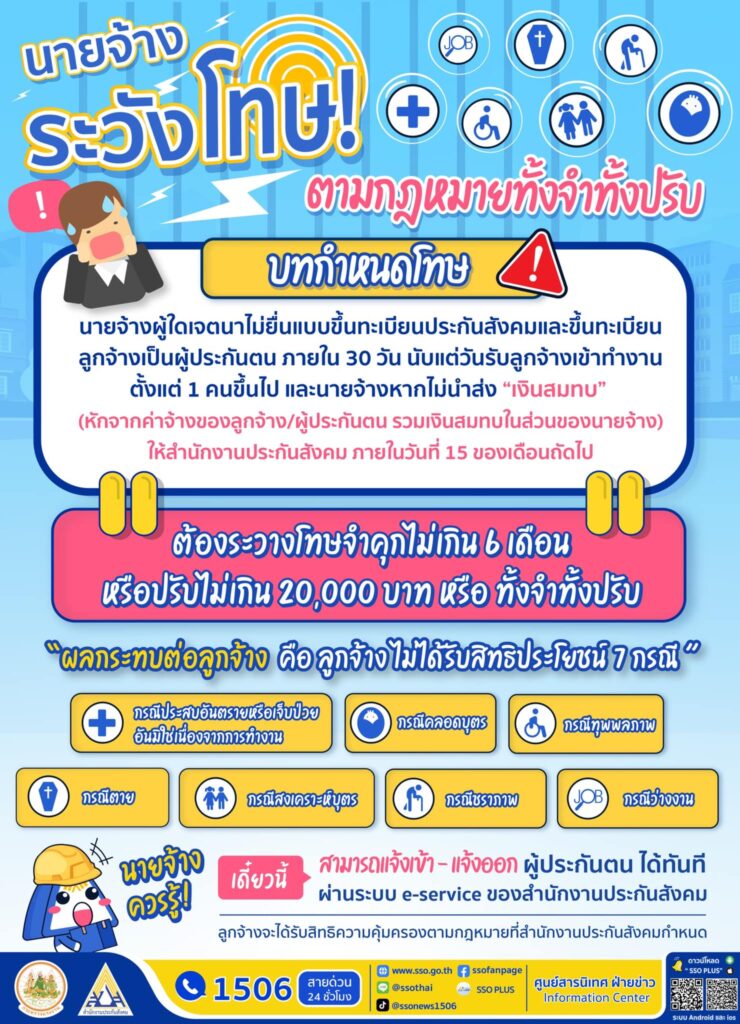 สำนักงานประกันสังคม เตือน นายจ้างผู้ใดเจตนาไม่ยื่นแบบขึ้นทะเบียนประกันสังคมและขึ้นทะเบียนลูกจ้างเป็นผู้ประกันตน ภายใน 30 วัน นับแต่วันรับลูกจ้างเข้าทำงาน ตั้งแต่ 1 คนขึ้นไป และนายจ้างหากไม่นำส่ง “เงินสมทบ” (หักจากค่าจ้างของลูกจ้าง/ผู้ประกันตน รวมเงินสมทบในส่วนของนายจ้าง) ให้สำนักงานประกันสังคม ภายในวันที่ 15 ของเดือนถัดไป ต้องระวางโทษจำคุกไม่เกิน 6 เดือนหรือปรับไม่เกิน 20,000 บาท หรือ ทั้งจำทั้งปรับ