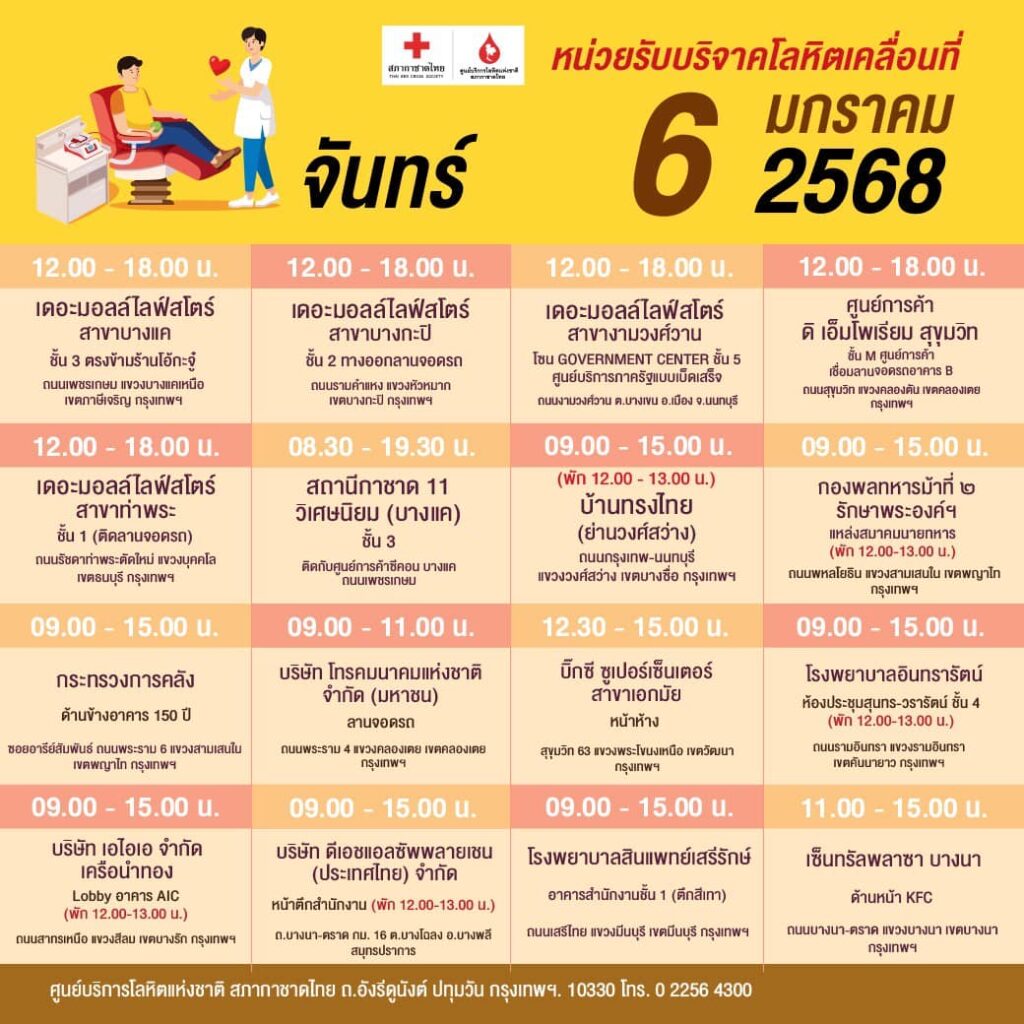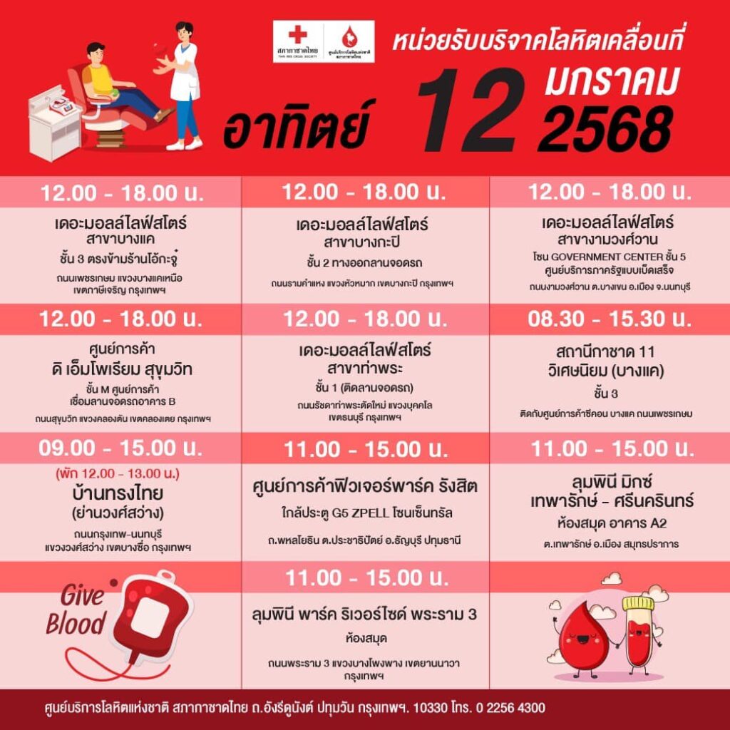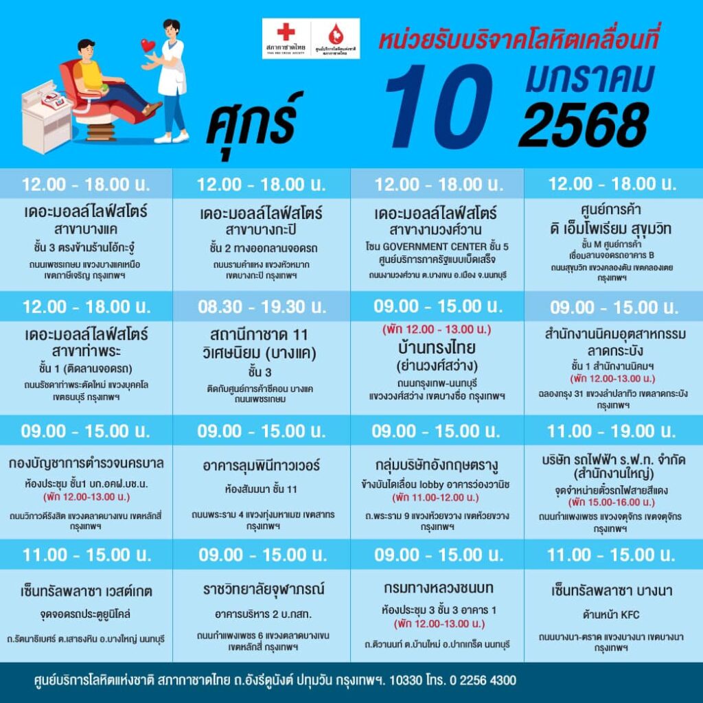 สภากาชาดไทย ออกหน่วยรับบริจาคโลหิตเคลื่อนที่ วันที่ 6 – 12 มกราคม 2568