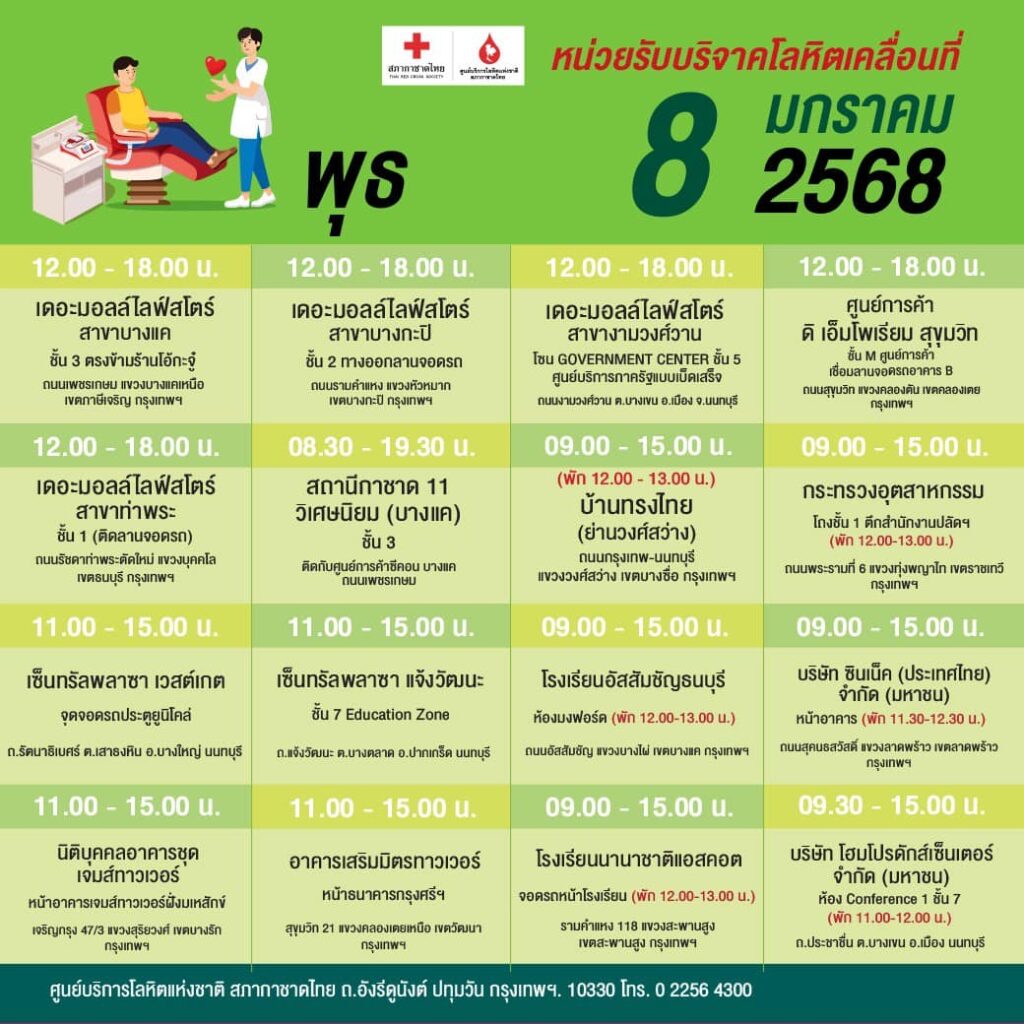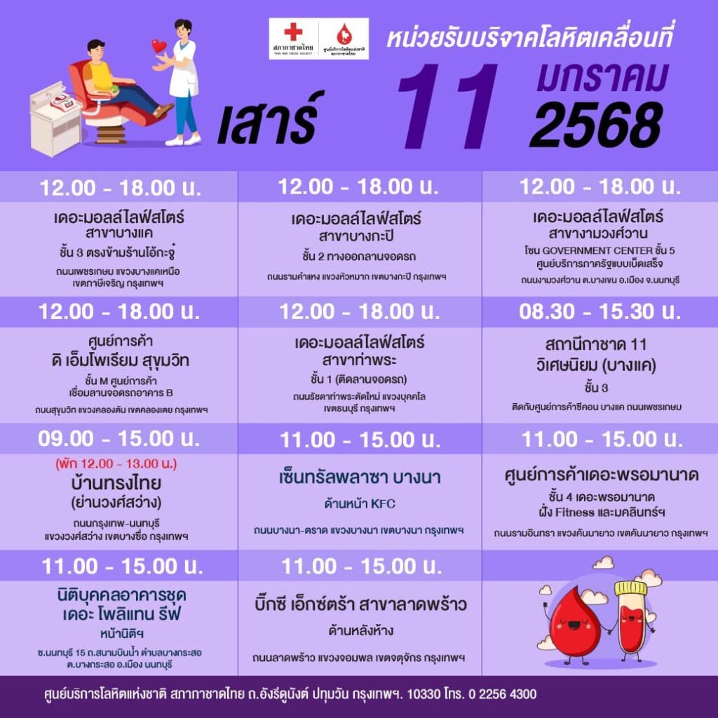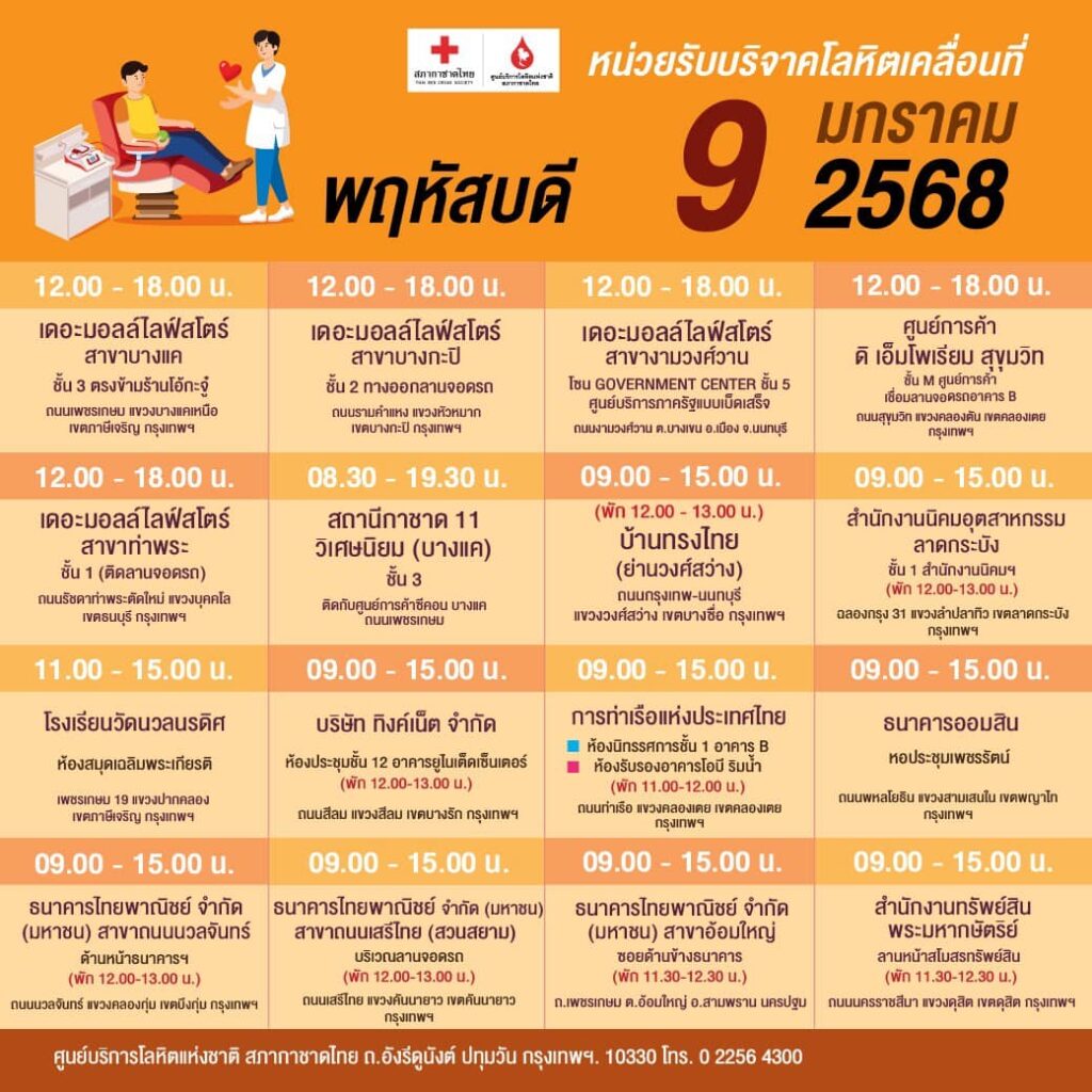 สภากาชาดไทย ออกหน่วยรับบริจาคโลหิตเคลื่อนที่ วันที่ 6 – 12 มกราคม 2568