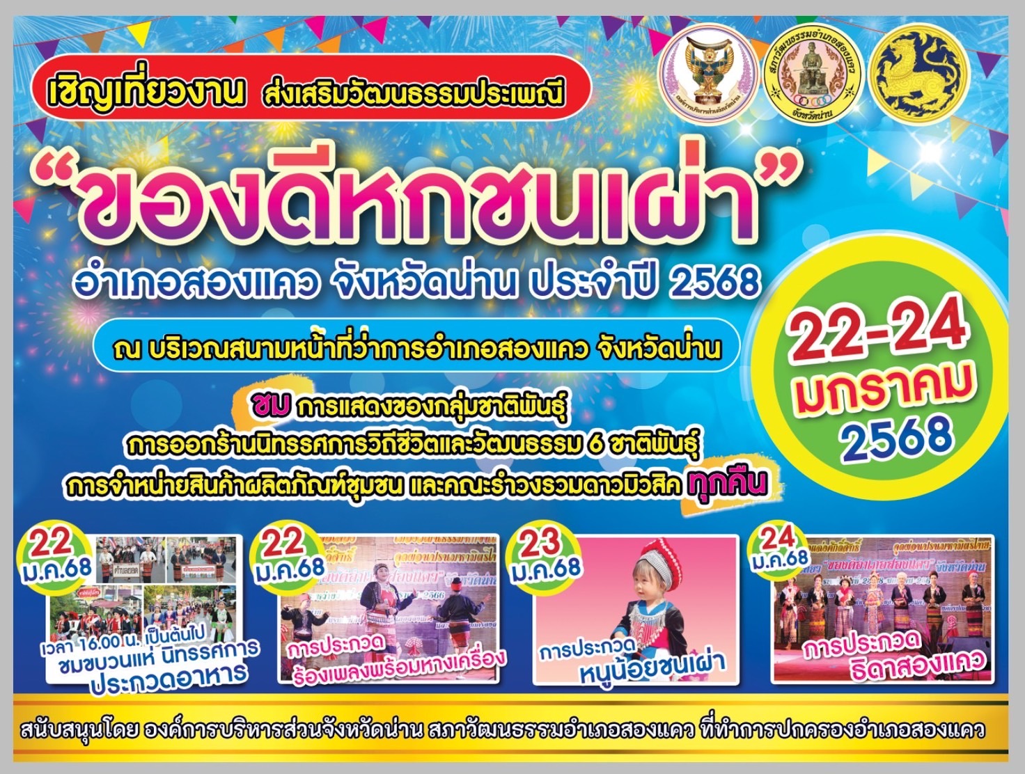 ททท.สำนักงานน่าน เชิญเที่ยวงานส่งเสริมวัฒนธรรมประเพณี “ของดีหกชนเผ่า” ประจำปี พ.ศ. 2568 วันที่ 22 – 24 มกราคม 2568 ณ สนามหน้าที่ว่าการอำเภอสองแคว จังหวัดน่าน