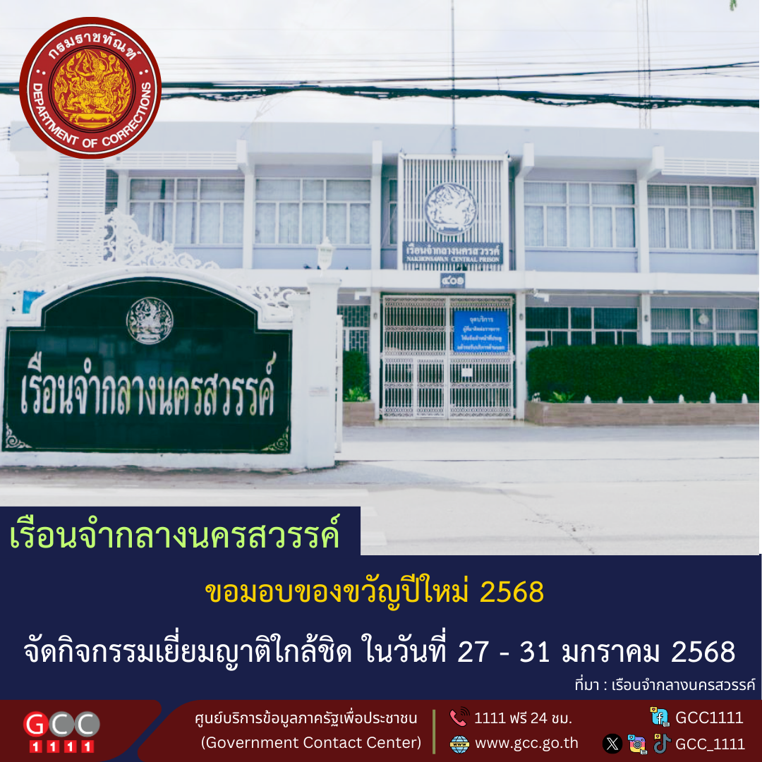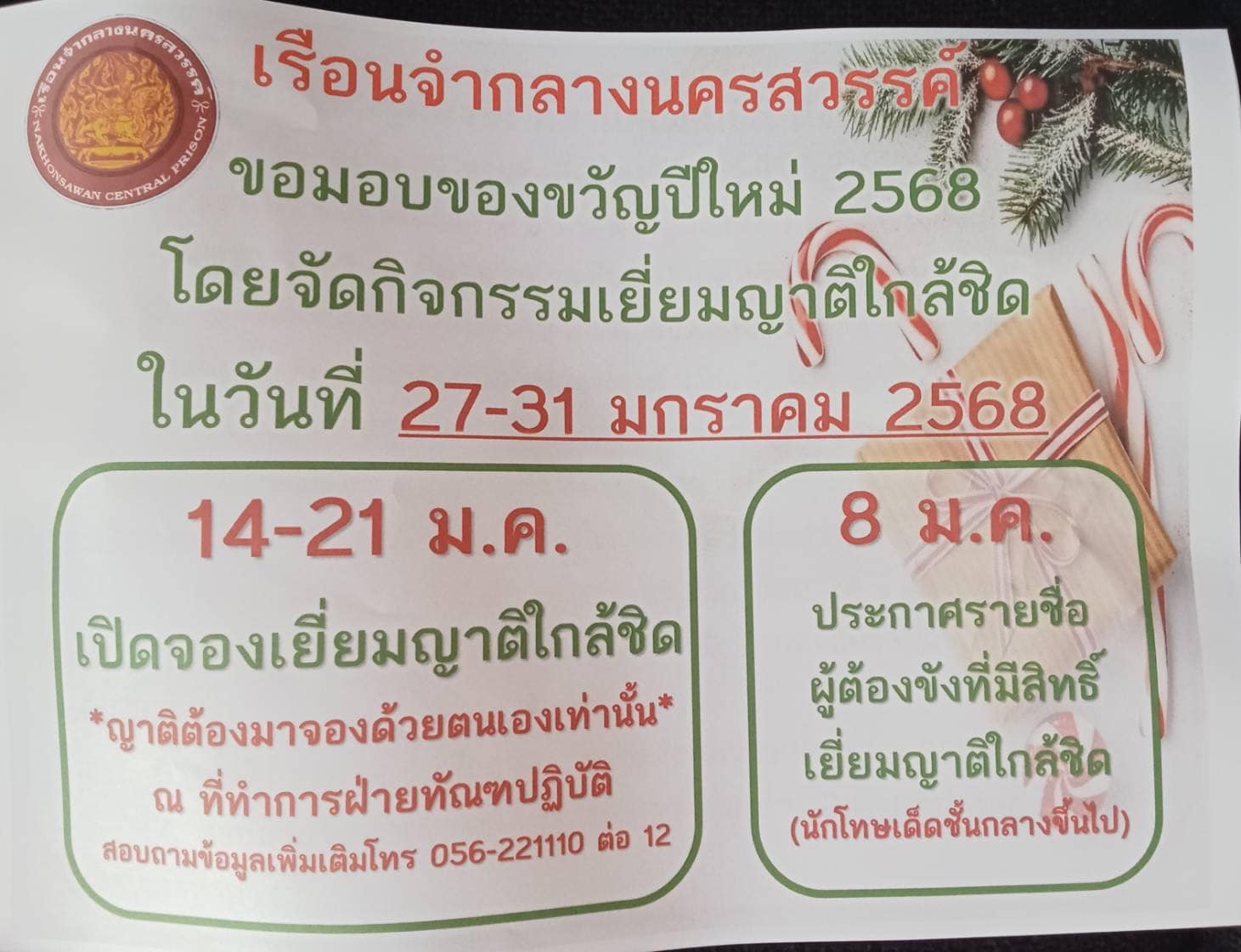 เรือนจำกลางนครสวรรค์ ขอมอบของขวัญปีใหม่ 2568 โดยจัดกิจกรรมเยี่ยมญาติใกล้ชิด ในวันที่ 27 – 31 มกราคม 2568