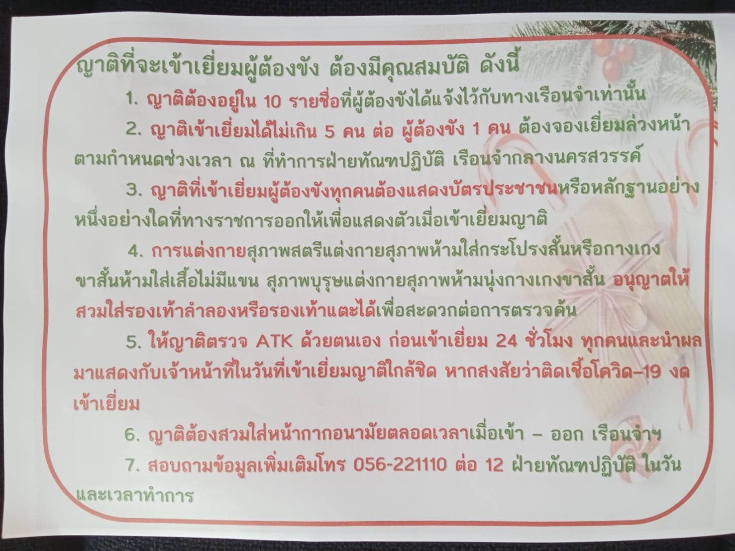 - เปิดจองเยี่ยมญาติใกล้ชิด ญาติต้องมาจองด้วยตนเองเท่านั้น ณ ที่ทําการฝ่ายทัณฑปฏิบัติ