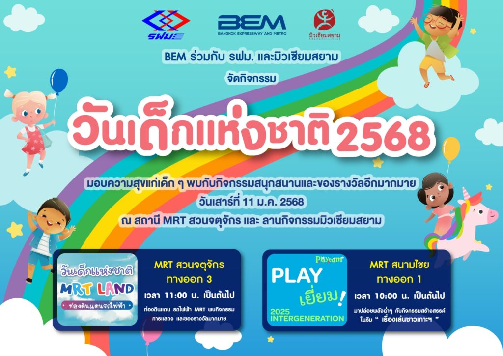 บริษัท ทางด่วนและรถไฟฟ้ากรุงเทพ จำกัด (มหาชน) หรือ BEM จับมือพันธมิตรจัดงานวันเด็ก 2 สถานที่ 2 ธีมสุดสนุก ในวันเสาร์ที่ 11 มกราคม 2568 ที่ MRT สถานีสวนจตุจักร – ลานกิจกรรมมิวเซียมสยาม