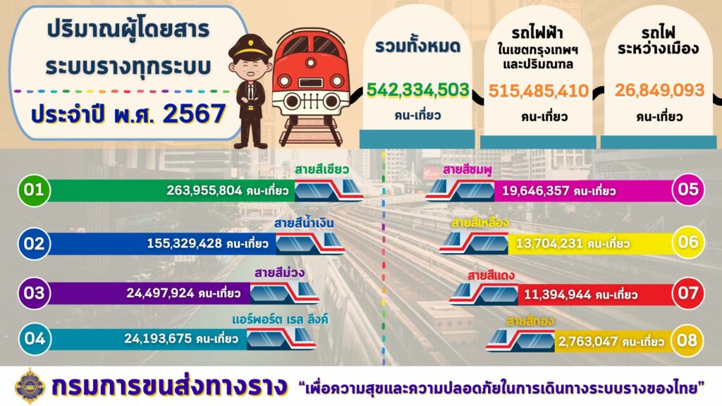 กรมการขนส่งทางราง เปิดเผยปริมาณผู้ใช้บริการระบบขนส่งทางราง ประจำปี 2567