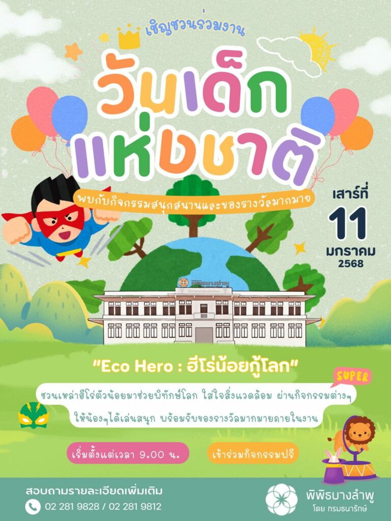 พิพิธบางลำพู ขอเชิญร่วมงานกิจกรรมวันเด็กแห่งชาติ 2568 ภายใต้แนวคิด Eco Hero : ฮีโร่น้อยกู้โลก วันเสาร์ที่ 11 มกราคม 2568 เวลา 9.00 น. เป็นต้นไป
