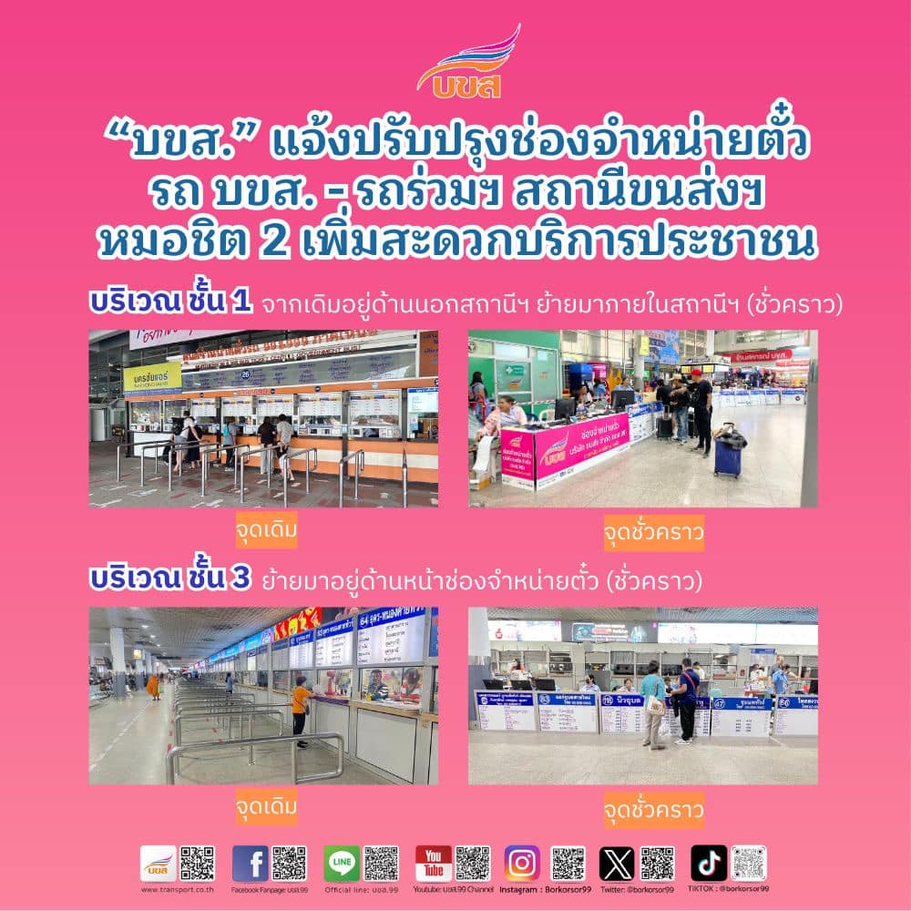 บขส. ได้ดำเนินการปรับปรุงพื้นที่ช่องจำหน่ายตั๋วโดยสาร (รถ บขส. และรถร่วมฯ) บริเวณชั้น 1 ด้านหน้า และ ชั้น 3 ภายในอาคารสถานีขนส่งผู้โดยสารกรุงเทพ (จตุจักร) หรือหมอชิต 2 ใหม่ ให้มีความทันสมัย เป็นระเบียบ และมีมาตรฐาน เพื่ออำนวยความสะดวกประชาชนให้ได้รับความสะดวก รวดเร็ว ปลอดภัย และไร้รอยต่อ โดยคาดว่าจะดำเนินการจะแล้วเสร็จภายในเดือนมีนาคม 2568