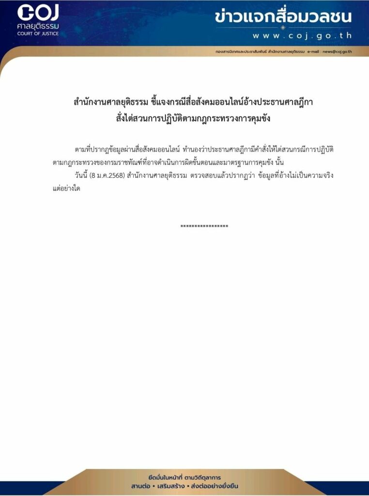 สำนักงานศาลยุติธรรม ชี้แจงกรณีสื่อสังคมออนไลน์อ้างประธานศาลฎีกาสั่งไต่สวนการปฏิบัติตามกฎกระทรวงการคุมขัง