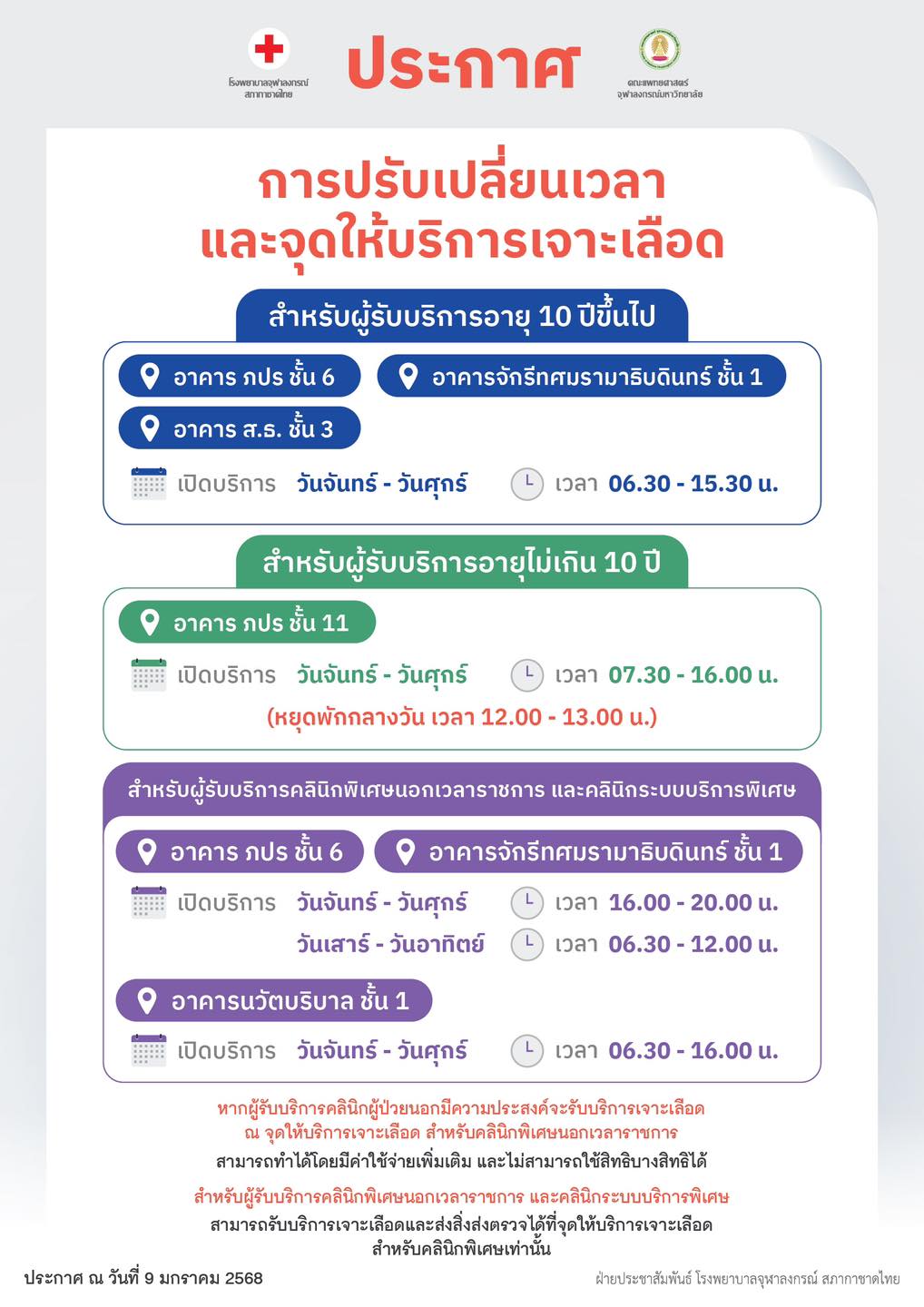 โรงพยาบาลจุฬาลงกรณ์ สภากาชาดไทย แนะนำ การปรับเปลี่ยนเวลาและจุดให้บริการเจาะเลือด