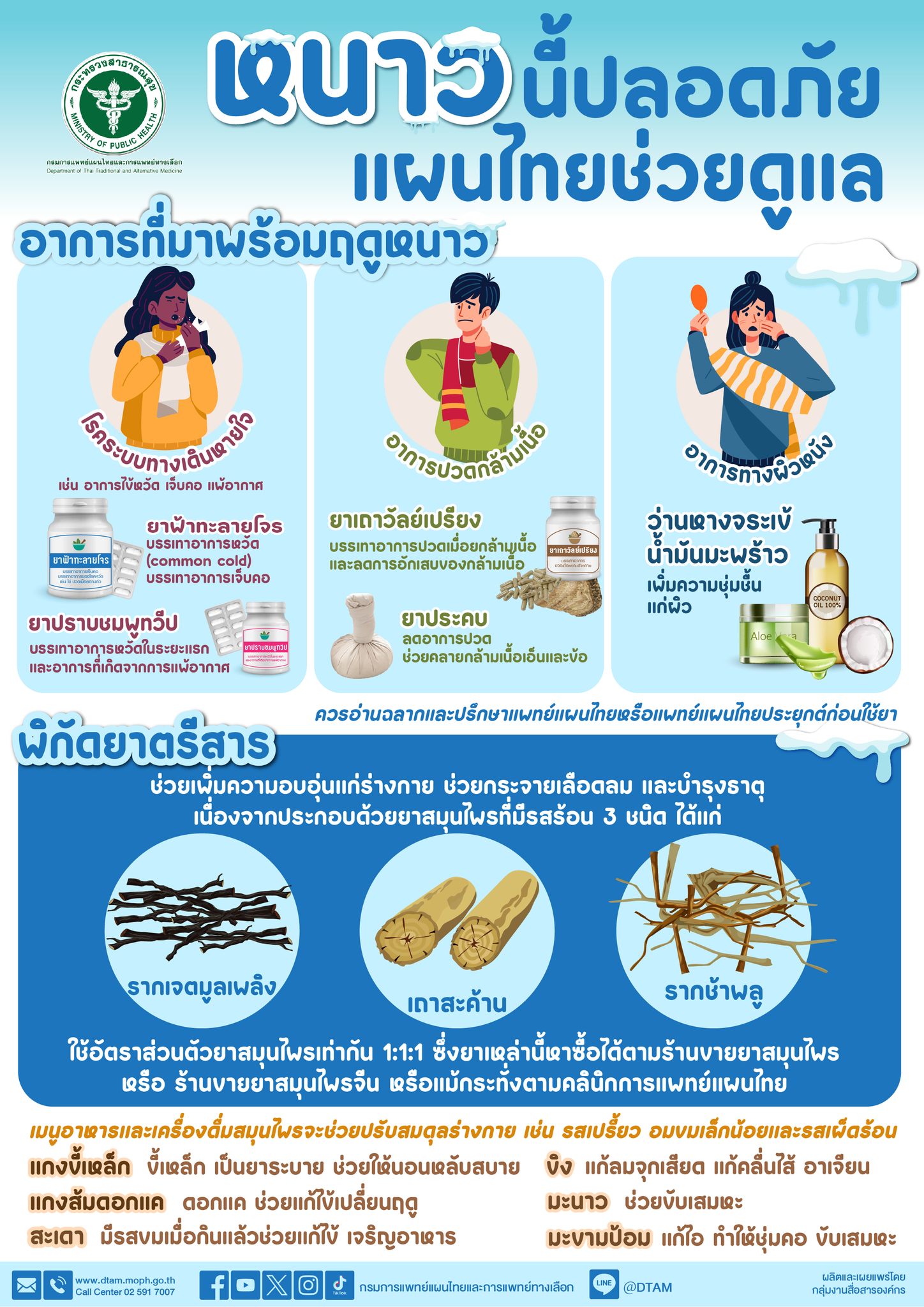 กรมการแพทย์แผนไทยฯ แนะยาสมุนไพรใกล้ตัวใช้ดูแลสุขภาพในช่วงฤดูหนาว ข่าวสารกิจกรรม กรมการแพทย์แผนไทยฯ แนะยาสมุนไพรใกล้ตัวใช้ดูแลสุขภาพในช่วงฤดูหนาว กรมการแพทย์แผนไทยและการแพทย์ทางเลือก แนะยาสมุนไพรใกล้ตัวใช้ดูแลสุขภาพในช่วงฤดูหนาว โดยเฉพาะ 3 กลุ่มอาการที่มักพบบ่อย เช่น โรคระบบทางเดินหายใจ อาการปวดกล้ามเนื้อ และอาการทางผิวหนัง สมุนไพรใกล้ตัวใช้ดูแลสุขภาพ ได้แก่ยาฟ้าทะลายโจร ยาปราบ ชมพูทวีป ยาเถาวัลย์เปรียง ยาประคบ ว่านหางจระเข้ และสมุนไพรใกล้ตัว รสขม เปรี้ยว เผ็ดร้อน ดูแลสุขภาพช่วงฤดูหนาวสามารถสอบถามข้อมมูลเพิ่มเติมได้ที่โทร. 0 2149 5678line : @DTAM ที่มา : https://shorturl.asia/O4WPr Post Views: 38 FacebookFacebookXTwitterLINELine