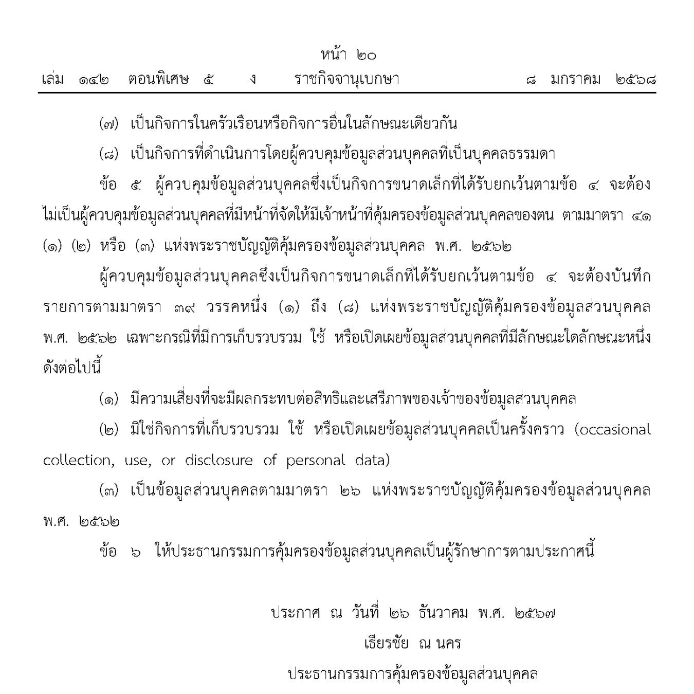 ประกาศคณะกรรมการคุ้มครองข้อมูลส่วนบุคคล เรื่อง การยกเว้นการบันทึกรายการของผู้ควบคุมข้อมูลส่วนบุคคลซึ่งเป็นกิจการขนาดเล็ก พ.ศ. 2567 มีผลใช้บังคับวันที่ 9 มกราคม 2568