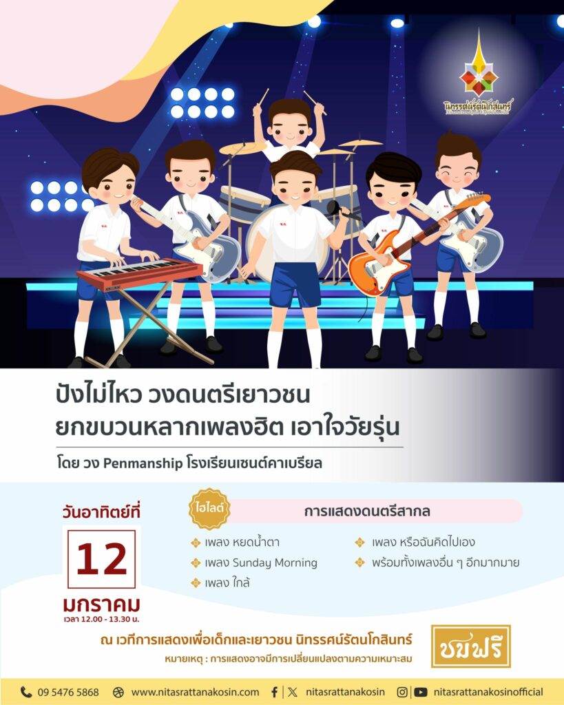 - การแสดงดนตรีสากล ของวงดนตรีเยาวชน วง Penmanship โรงเรียนเซนต์คาเบรียล ที่จะยกขบวนหลากเพลงฮิต มาเอาใจวัยรุ่น อาทิ