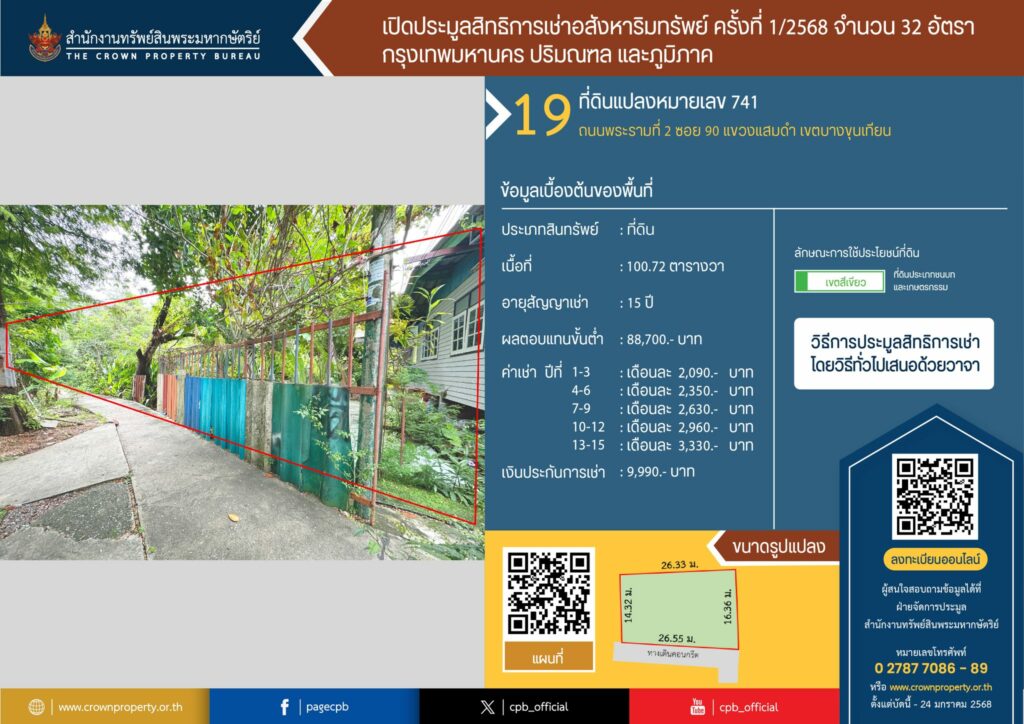 สำนักงานทรัพย์สินพระมหากษัตริย์ เปิดประมูลสิทธิการเช่า 15 ปี ที่ดินแปลงหมายเลข 741 ตั้งแต่บัดนี้ – 24 มกราคม 2568 ค่าเช่าเริ่มต้นที่ 2,090.- บาท/เดือน พิกัด : ถนนพระรามที่ 2 ซอย 90 แขวงแสมดำ เขตบางขุนเทียน กรุงเทพมหานคร https://maps.app.goo.gl/ok2FGZNJnetbQu4R8