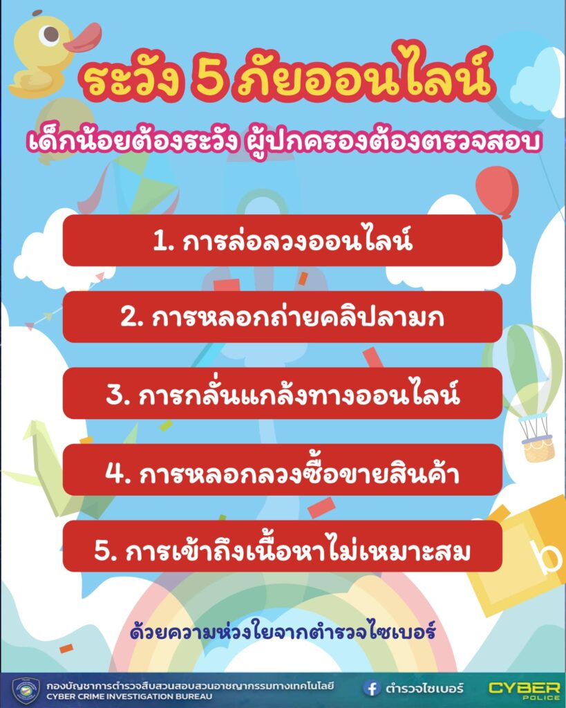 บช.สอท. แจ้งเตือนระวัง 5 ภัยออนไลน์ เด็กน้อยต้องระวัง ผู้ปกครองต้องตรวจสอบ