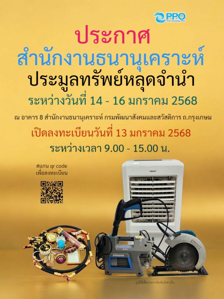 สธค. โรงรับจำนำของรัฐ เปิดจำหน่ายทรัพย์หลุดจำนำ ระหว่างวันที่ 14 – 16 มกราคม 2568
