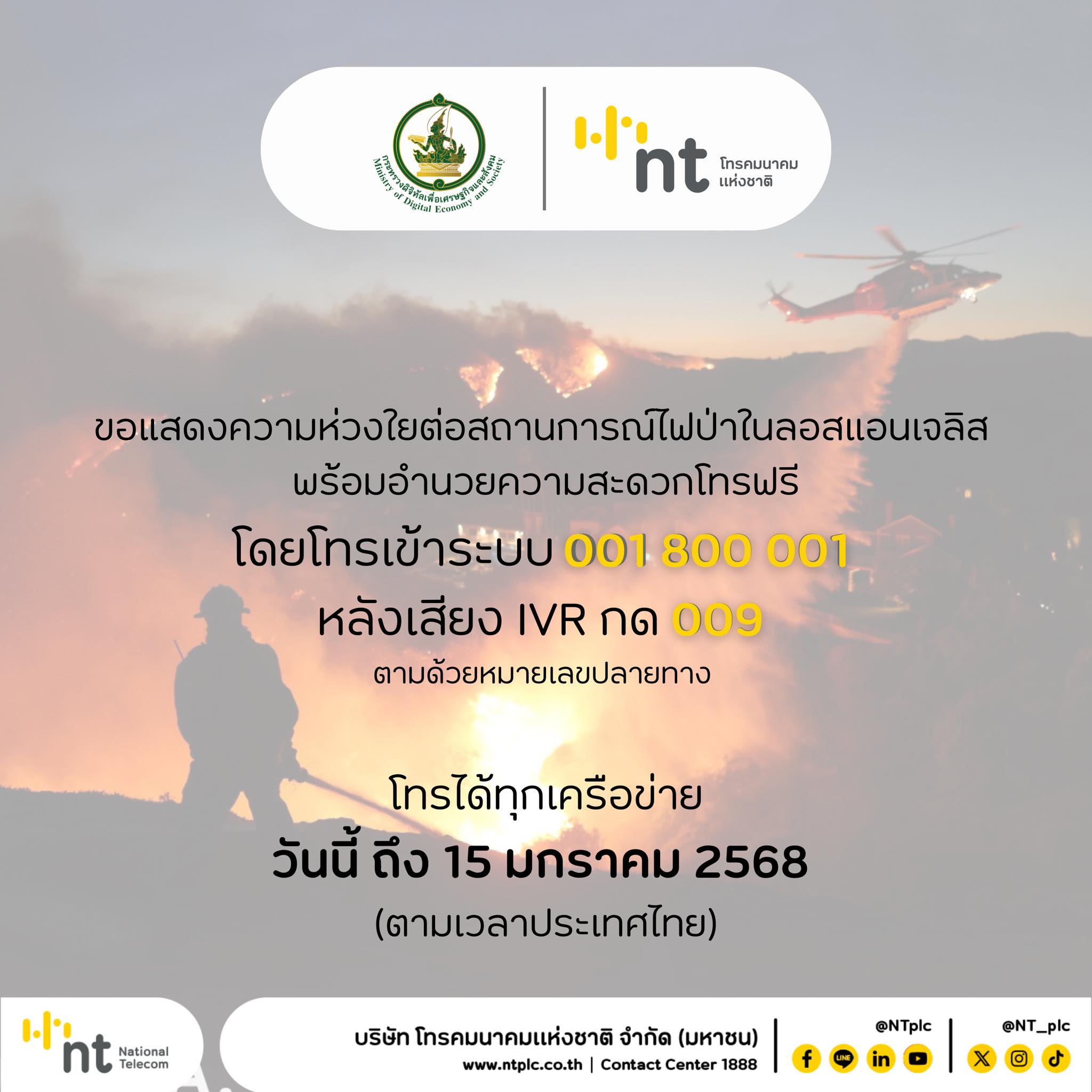 บริษัท โทรคมนาคมแห่งชาติ จำกัด (มหาชน) ขอแสดงความห่วงใยต่อสถานการณ์ไฟป่าในลอสแอนเจลิส พร้อมอำนวยความสะดวกโทรฟรี โดยโทรเข้าระบบ 001 800 001 >> หลังเสียง IVR กด 009 >> ตามด้วยหมายเลขปลายทาง โทรได้ทุกเครือข่าย วันนี้ – 15 มกราคม 2568 (ตามเวลาประเทศไทย)