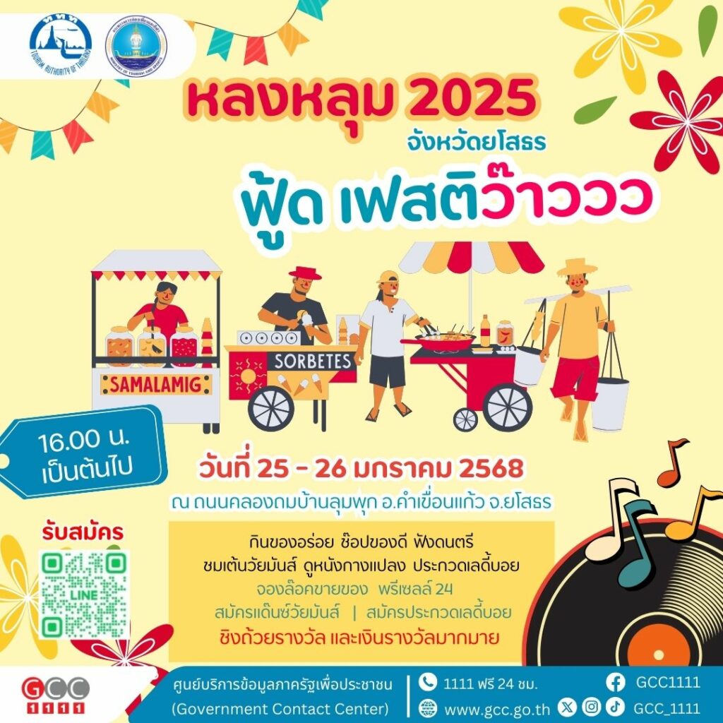 การท่องเที่ยวแห่งประเทศไทย เชิญเที่ยวงาน ฟู้ด เฟสติว๊าววว หลงลุม 2025 จังหวัดยโสธร วันที่ 25 – 26 มกราคม 2568 เวลา 16.00 น. เป็นต้นไป ณ ถนนคลองถมบ้านลุมพุก อ.คำเขื่อนแก้ว จ.ยโสธร