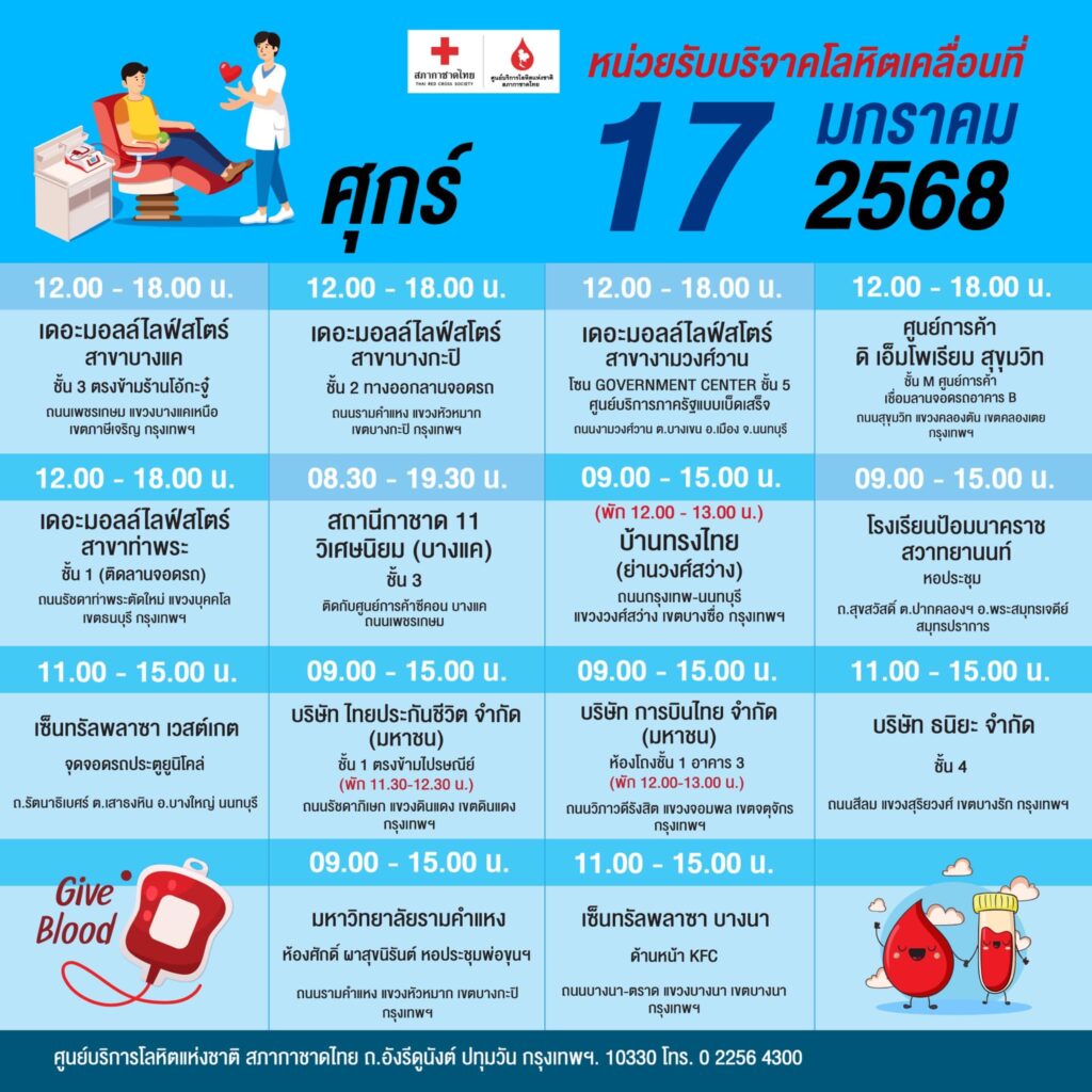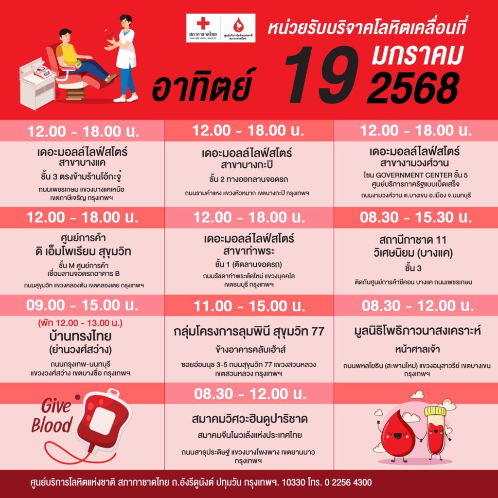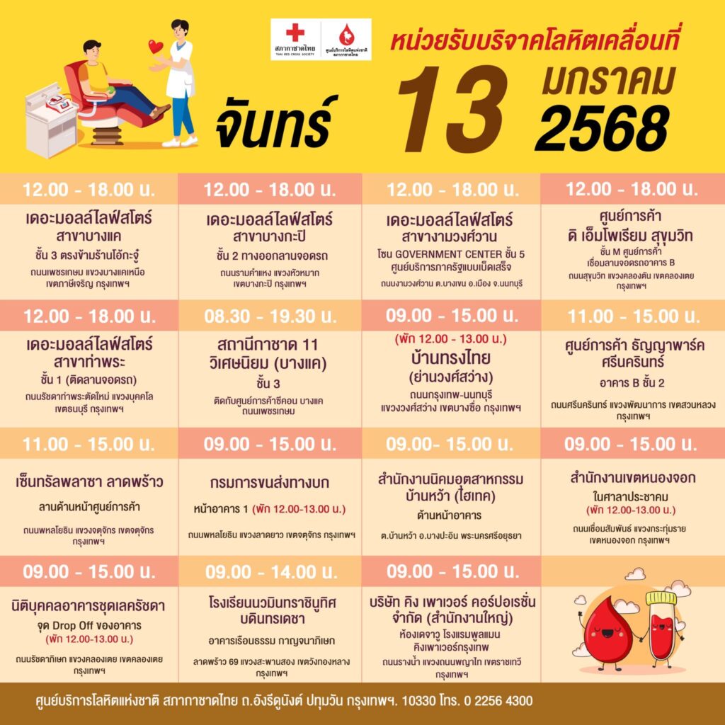 สภากาชาดไทย ออกหน่วยรับบริจาคโลหิตเคลื่อนที่ วันที่ 13 – 19 มกราคม 2568
