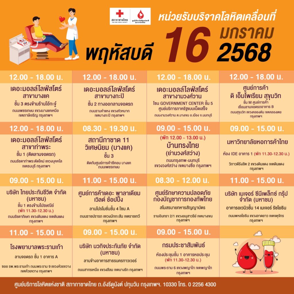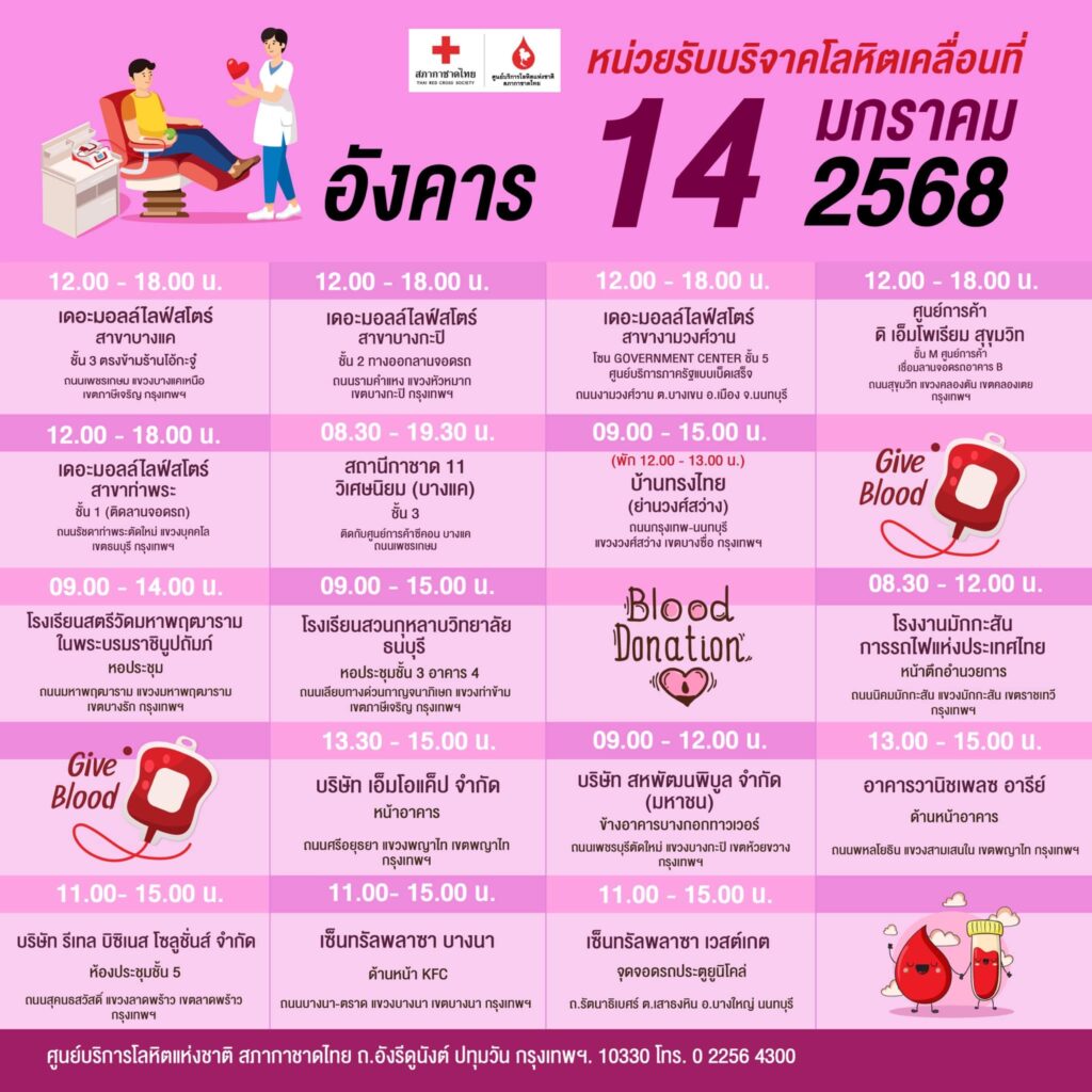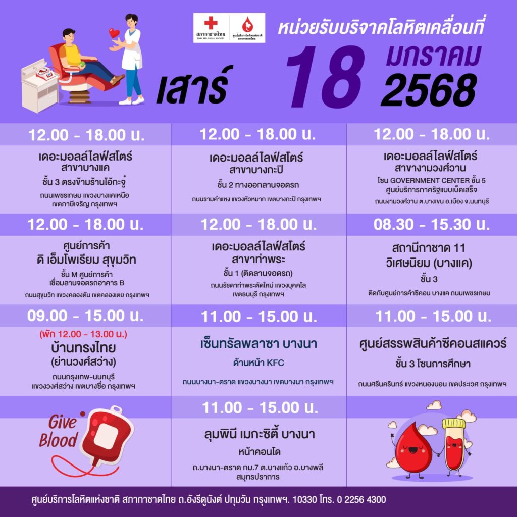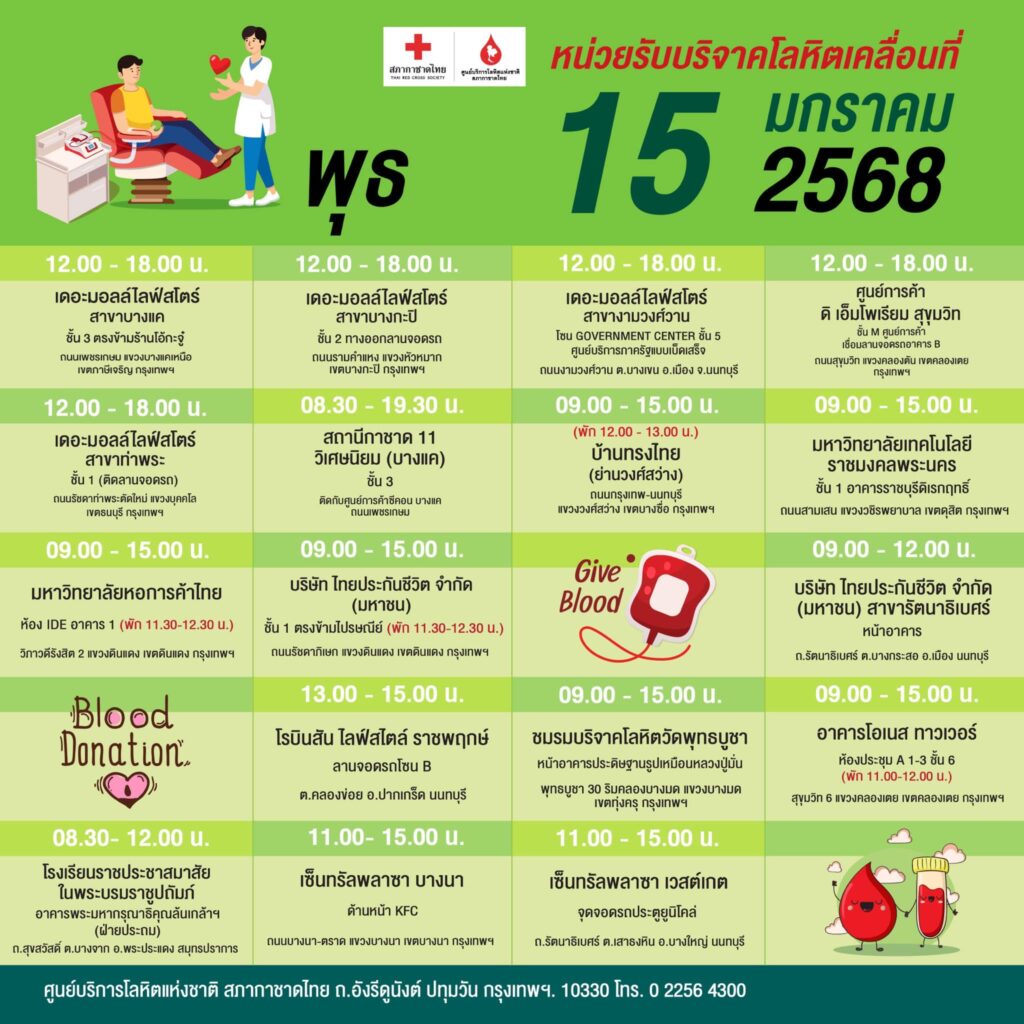 สภากาชาดไทย ออกหน่วยรับบริจาคโลหิตเคลื่อนที่ วันที่ 13 – 19 มกราคม 2568