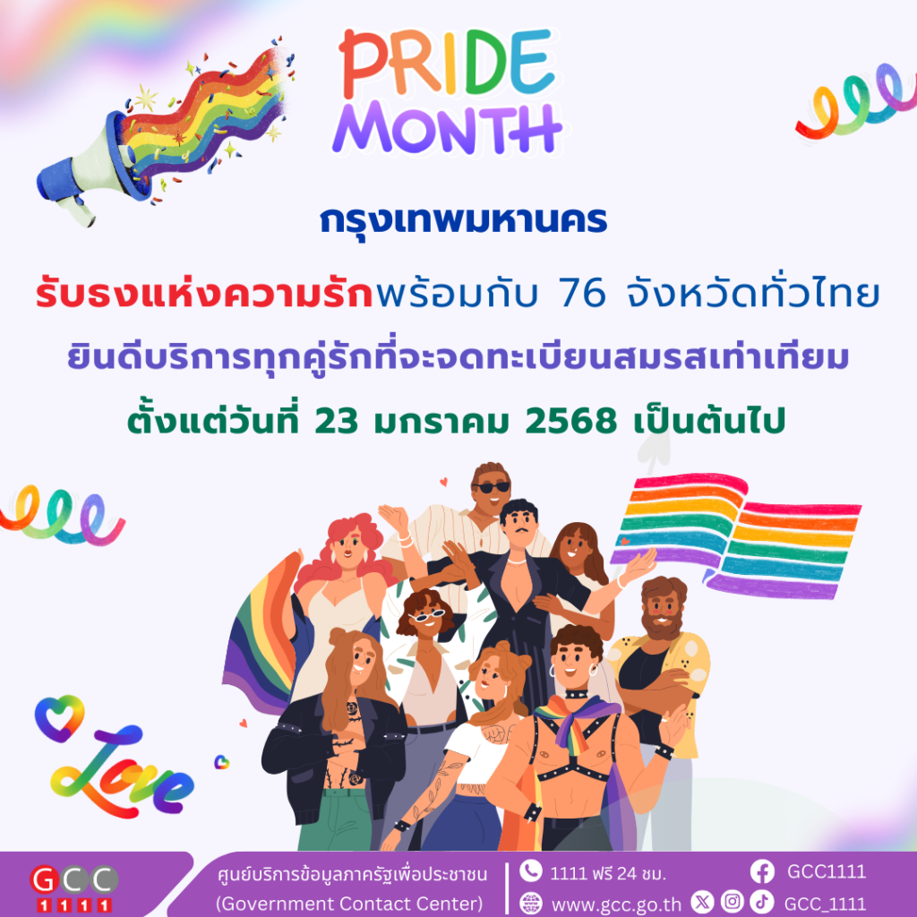 กทม. รับธงแห่งความรักพร้อมกับ 76 จังหวัดทั่วไทย ยินดีบริการทุกคู่รักที่จะจดทะเบียนสมรสเท่าเทียมวันที่ 23 ม.ค. 68