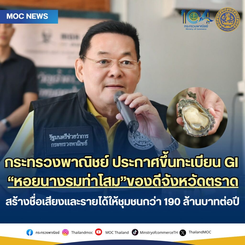 กระทรวงพาณิชย์ ประกาศขึ้นทะเบียน “หอยนางรมท่าโสม” เป็นสินค้าสิ่งบ่งชี้ทางภูมิศาสตร์ (GI) ลำดับที่ 4 ของจังหวัดตราด